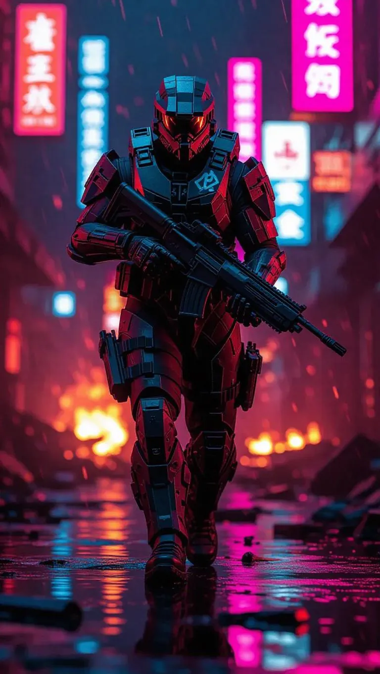 Hyperrealistic dark neon city scene, Trevor in tattered futuristic armor, walking through a burning street, glowing graffiti, holding a plasma shotgun made from scrap tech, blood stains on his outfit, gritty atmosphere, flickering neon signs, cinematic violence, detailed destruction behind him, urban decay, intense lighting, cyberpunk flair