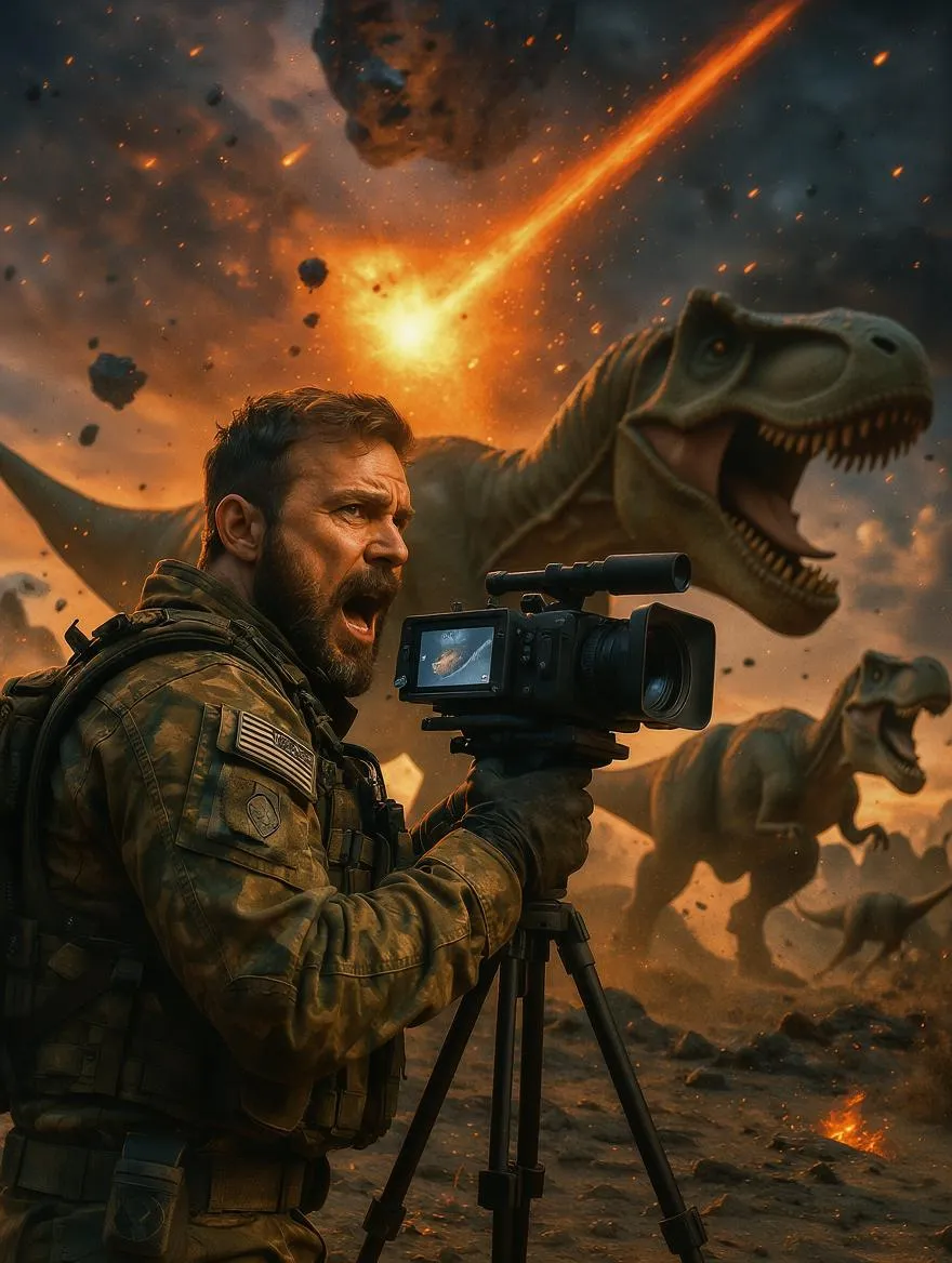 A dramatic, high-energy scene where a battlefield journalist, with a look of intense urgency, reports live on the imminent asteroid impact threatening Earth. The journalist, clad in rugged reporter gear, stands in the foreground, with a professional camera capturing the chaos. Behind, massive dinosaurs are frantically fleeing, adding a surreal element to the apocalyptic scene. The sky is filled with fiery streaks from the asteroid, while the ground trembles with the dinosaurs' powerful movements. Photorealistic textures, dynamic lighting, and deep contrasts highlight the tension, with vibrant colors amplifying the urgency of this cinematic disaster moment.