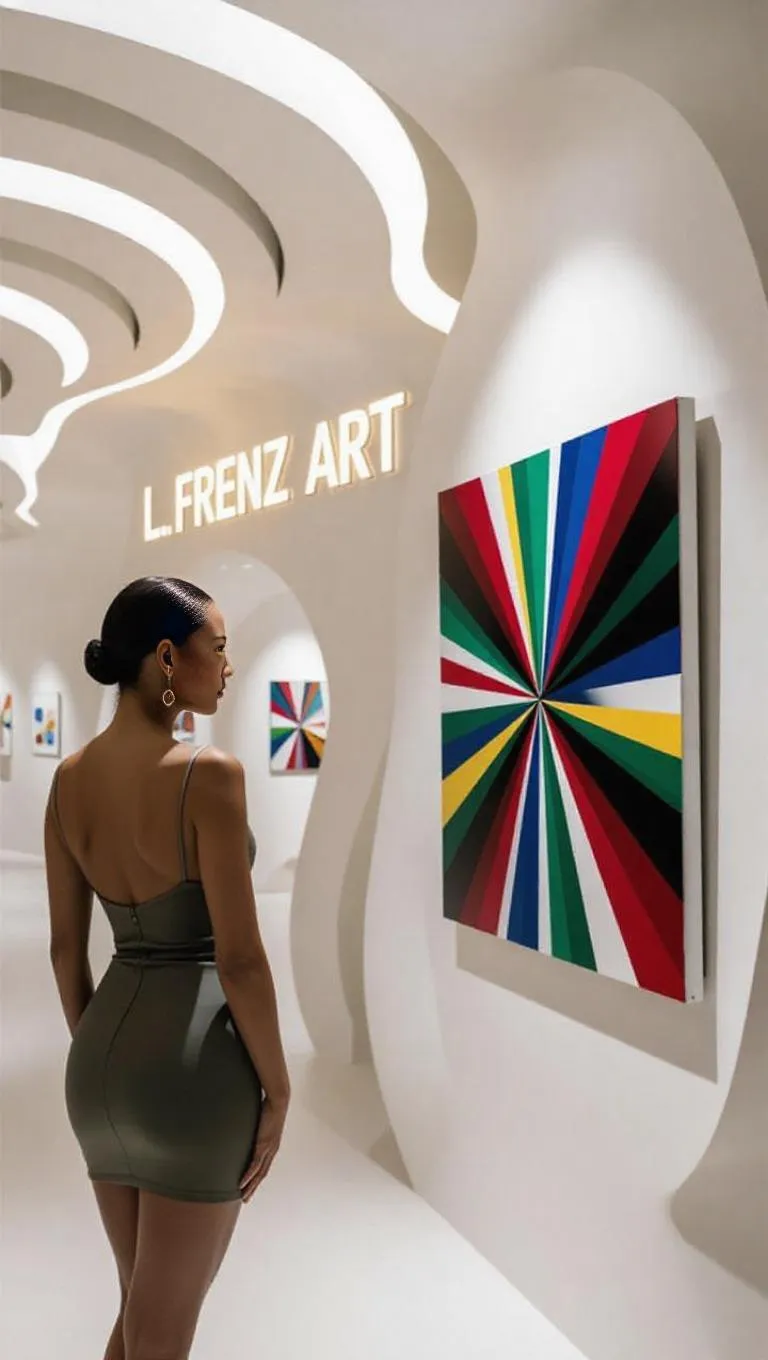 A woman in a short dress makes a bold fashion statement while admiring a vibrant abstract masterpiece in a sleek, minimalist modern gallery with curved fluid architecture and wavy walls, featuring the dynamic L. Frenz Art neon installation.