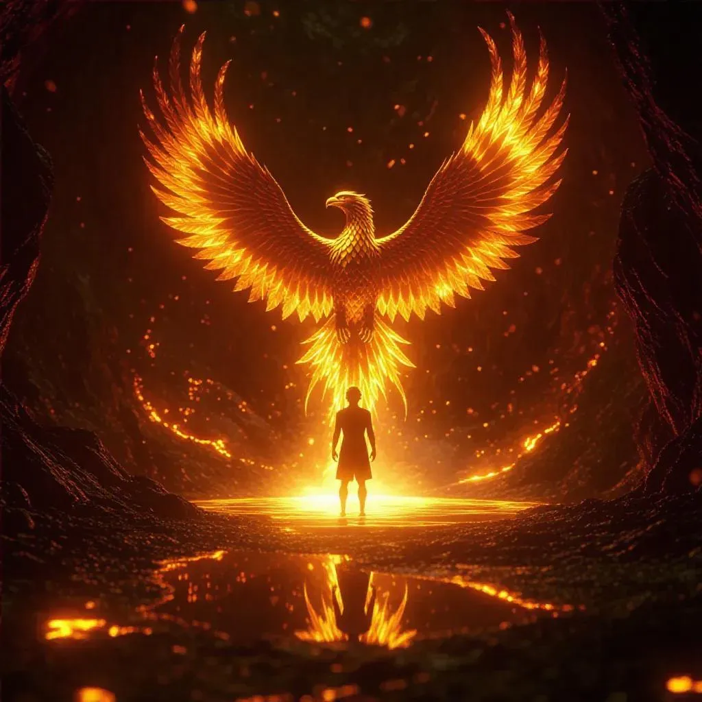 Ignite your creativity with this AI-generated cinematic scene of fiery rebirth. A molten-gold energy Phoenix emerges from volcanic flames, symbolizing transformation. Detailed volcanic caverns, swirling embers, and glowing reflections capture fantastical artistry. Perfect for fantasy visuals, cinematic storytelling, and symbolic AI-powered imagery blending fantasy, fire elements, and rebirth themes in vivid, warm-hued detail.