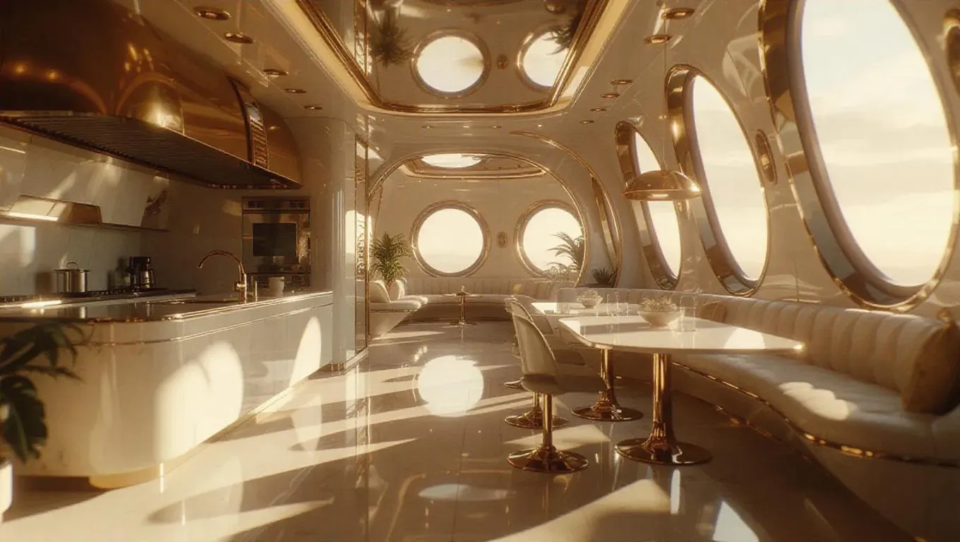 Generate stunning 8K Ultra HD AI images of a futuristic art nouveau spacecraft kitchen. Vivago.ai crafts photorealistic sci-fi interiors with cinematic detail, blending high-tech retro design, beige solarium walls, and panoramic space views. Perfect for professional-grade, ultra-realistic visual content.