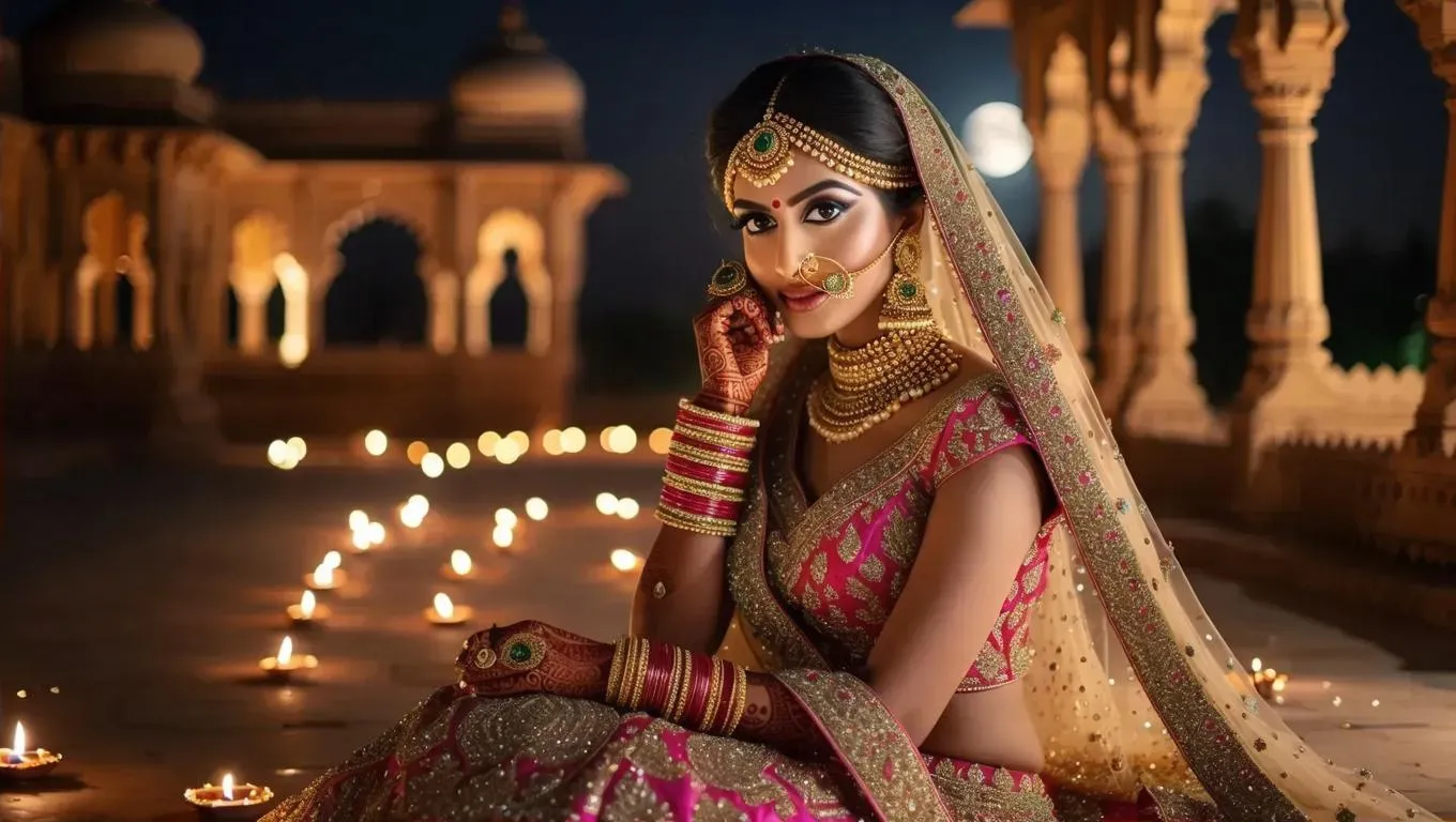 Generate an elegant dusky Indian princess adorned with traditional jewels and attire, set against a palace illuminated by diyas at night. Crystals shimmer on the ground as faint moonlight casts a mystical glow. Create royal, culturally rich AI visuals with VivaGO's advanced image generator for ethereal, professional-grade artistic results.