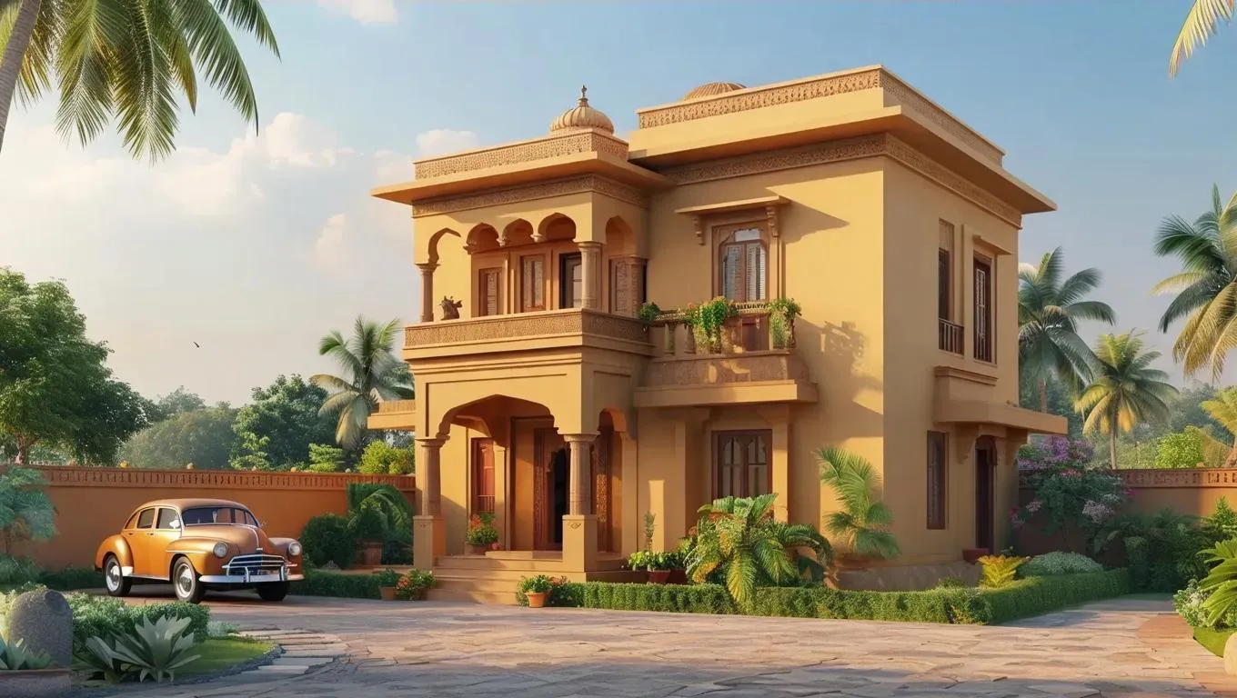 Create vibrant 3D cartoon visuals of a luxurious Indian village house with traditional architecture, ornate details, and a luxury car. AI-generated art blends cultural richness, modern wealth, and playful design for engaging animated scenes. Perfect for storytelling, cultural projects, or whimsical illustrations.