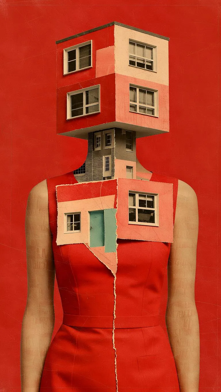 A smart, minimalist vintage collage featuring a portrait of a boxy modern building, assembled from torn and cut-out magazine clippings. Its façade is a surreal patchwork of contrasting architectural fragments—mismatched floor levels, windows from pastel-toned mid-century houses, and textures from retro ads. The structure takes on a human-like silhouette, with its form echoing a red dress against a bold crimson backdrop. The layering of matte paper textures and subtle grain evokes a tactile, analog feel. Visually striking, the composition balances clean editorial design with surreal urban storytelling, reminiscent of Bauhaus-inspired photo montages with a contemporary twist.