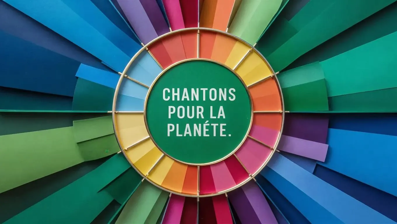 Vibrant AI-generated kaleidoscope effect with "Sing for the Planet" in light green text and a golden center. Transform eco-themed prompts into dazzling multicolor visuals using vivago.ai's creative tools for striking, professional-grade environmental advocacy content.