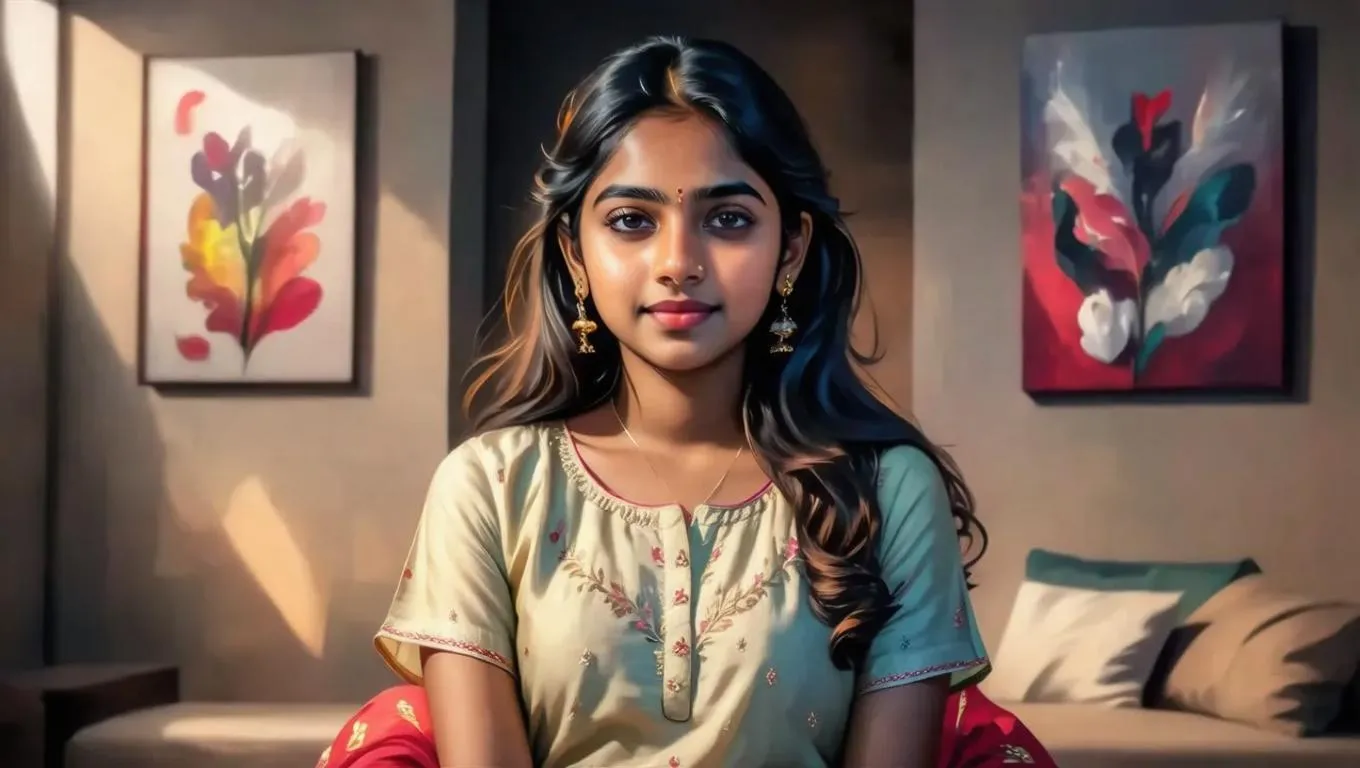 Create enchanting AI-generated visuals for YouTube storytelling with a shy 20-year-old in a stylish Indian kurti. Minimalist art-filled backdrop, ethereal lighting, and quiet intensity evoke intimate narratives. Perfect for AI-powered creative tools crafting professional-grade visual storytelling, anime effects, and engaging content for introverted storytellers.