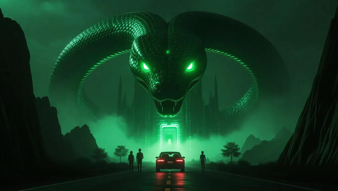 Transform text into cinematic AI art with vivago.ai. Generate a cyberpunk fantasy scene: four teens approach a colossal bioluminescent snake-like building with emerald eyes. Night setting highlights eerie glow as a dimensional door opens. Captured in a grand, cinematic long shot blending cyberpunk and fantasy elements for professional-grade visuals.