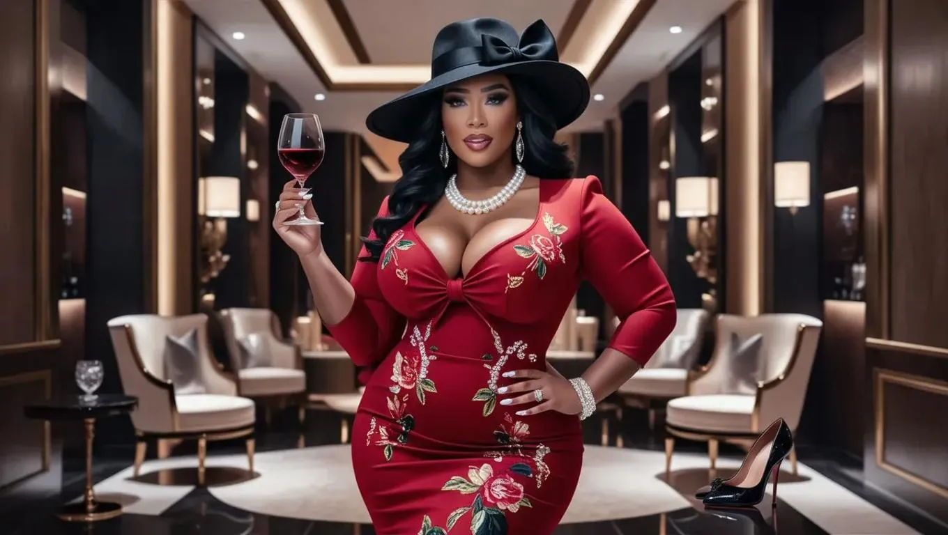 Generate stunning AI images of a confident woman in a crimson red floral bodycon dress, accessorized with black pearls, a bold knotted hat, and sleek stilettos. Vivago.ai crafts vivid, elegant AI fashion designs—perfect for luxe style inspiration, digital art projects, or dynamic social media visuals with rich details and sophisticated charm.