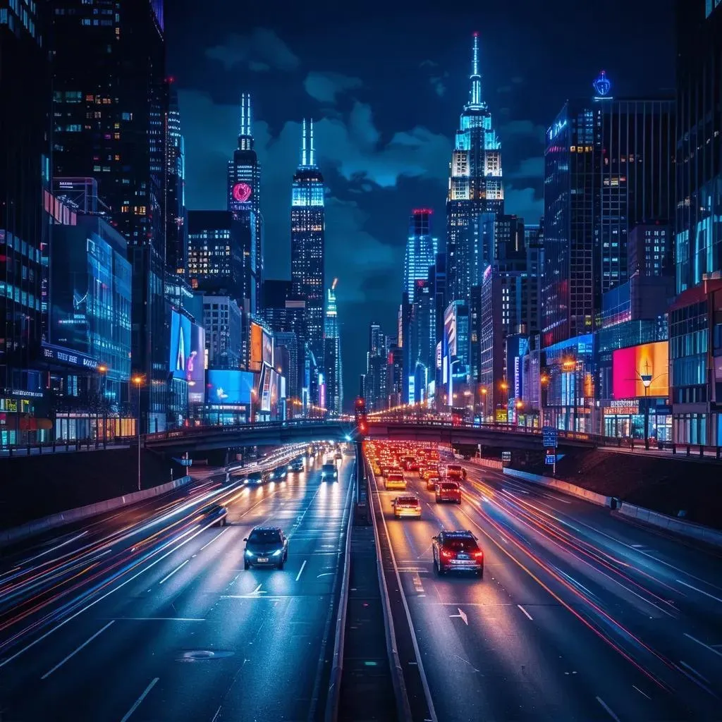 Generate a vibrant AI cityscape night scene with glowing skyscrapers, neon-lit streets, and dynamic light trails from bustling traffic. Capture long-exposure energy in a modern metropolis featuring diverse architecture, reflective rivers, and starry indigo skies. Perfect for urban photography enthusiasts seeking lively yet serene nighttime visuals.