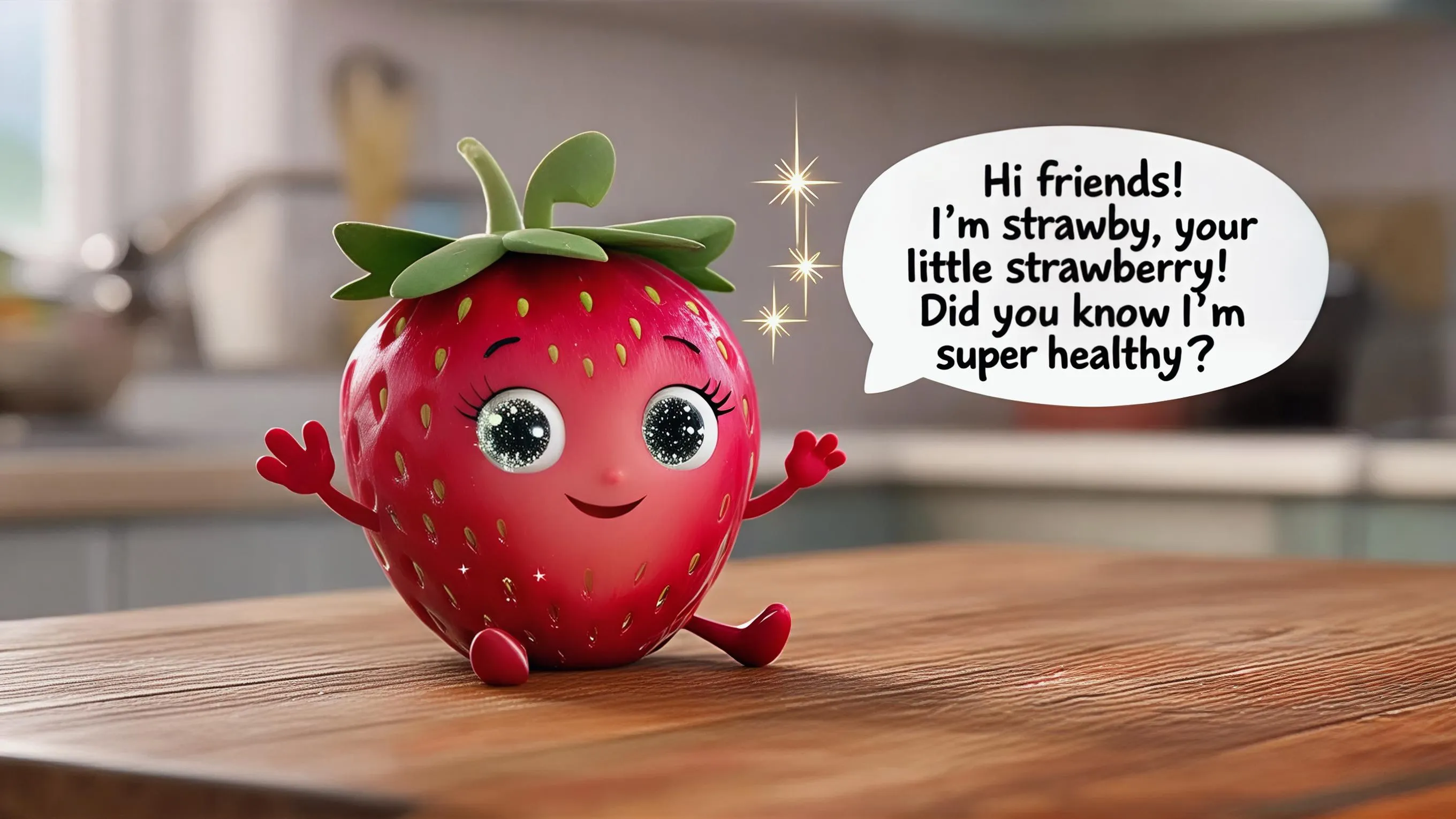 Generate adorable Strawby cartoon: cheerful strawberry character waving with sparkling effects on a wooden table. AI-powered animation tool creates this tiny fruit mascot promoting healthy eating through vibrant visuals. Perfect for fun, educational content creation.