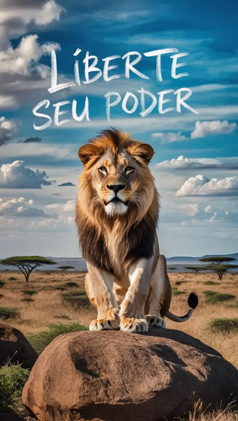 Generate vivid 4K AI images of a majestic lion standing on a rock, gazing over a sunlit savanna under a dynamic blue sky. "Liberte seu poder" etched in clouds embodies strength and leadership. Elevate creativity with vivago.ai's AI tools—transform prompts into professional-grade visuals, blending hyper-realistic detail and symbolic artistry for impactful, high-quality content.