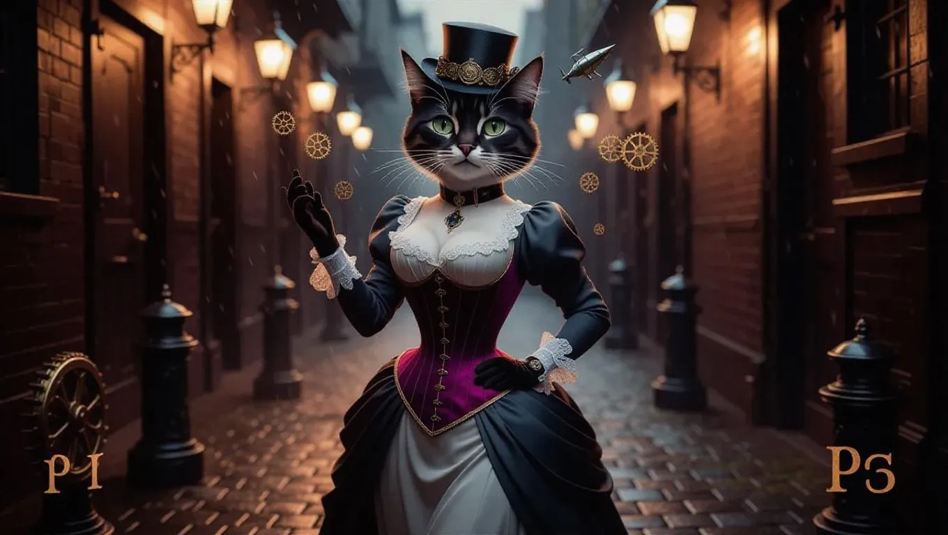 Create a mesmerizing AI-generated steampunk cat portrait featuring a Victorian-dressed anthropomorphic feline in a gaslit cobblestone alley. Explore intricate brass gears, velvet corset details, rain-kissed bokeh, and floating airship pendants with VivaGo.ai's advanced image tools for sharp, atmospheric anthropomorphic animal art blending elegance and retro-futuristic machinery.