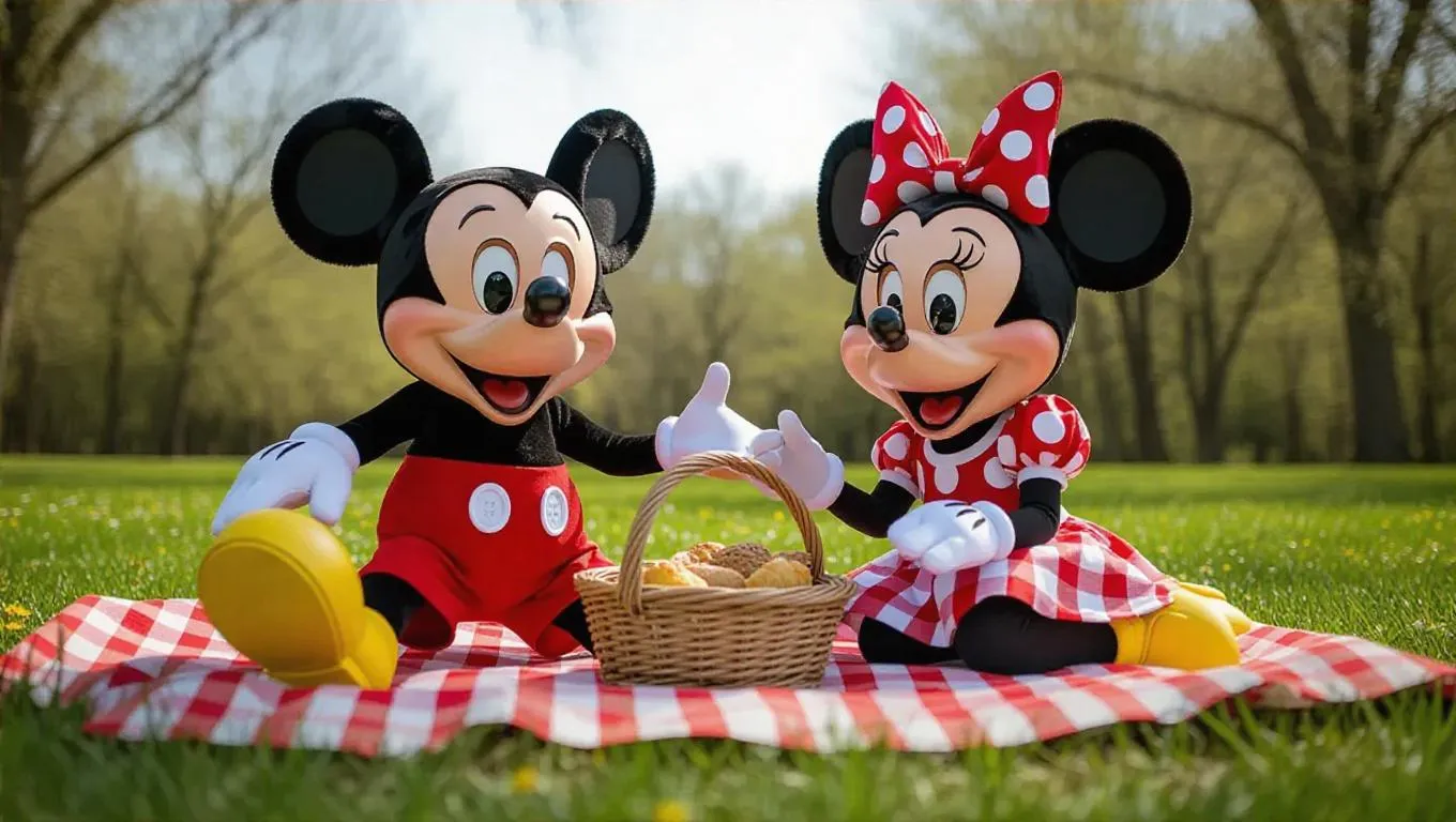 Create a lively AI-generated scene of Mickey Mouse and Minnie Mouse picnicking in a sunlit meadow. Features a vibrant red-and-white checkered blanket, picnic basket, and playful details. Perfect for Disney fans seeking cheerful, nostalgic visuals with Vivago.ai's AI image tools.