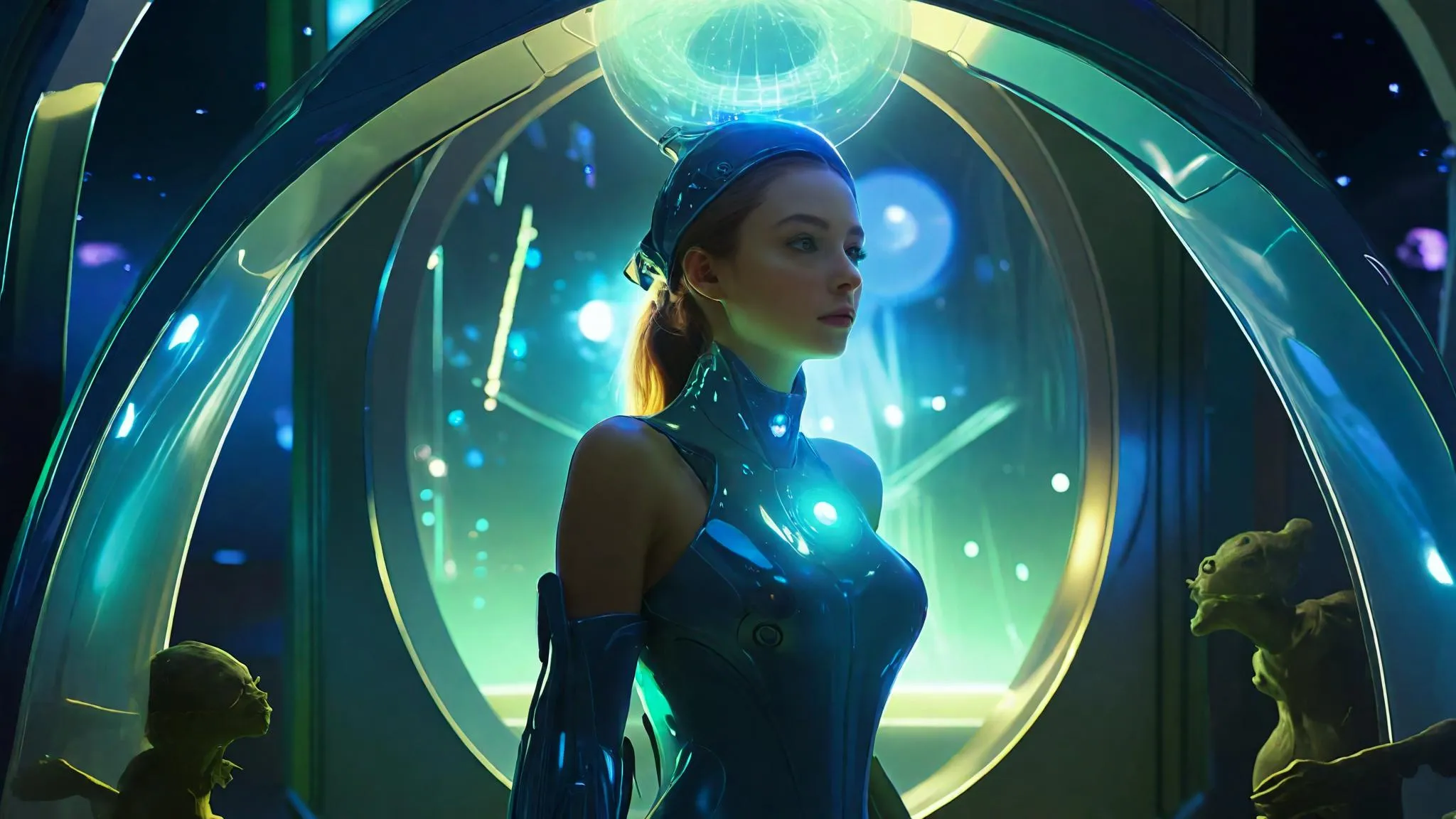 Immerse in hyperrealistic AI art blending surrealism and futurism. A celestial woman with bright blue eyes gazes upward, encircled by light rings and cosmic elements. A futuristic robot admires abstract digital art with geometric grids, Chinese letter motifs, and vibrant spheres. Experience cinematic realism in this close-up, immersive design merging organic and tech themes. #Hyperrealism #Surrealism #ImmersiveDesign #CinematicRealism