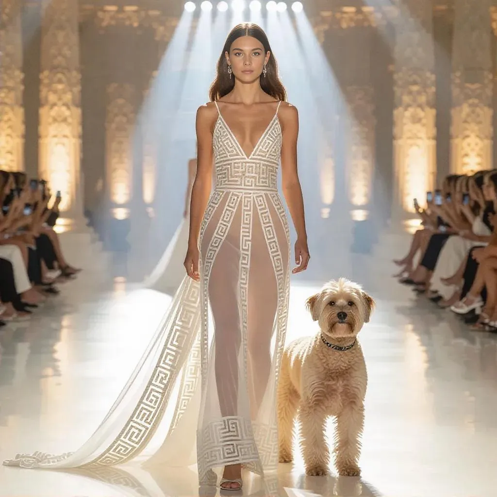 Experience an AI-crafted Parisian runway show fusing haute couture with ancient Greek Easter traditions. A model and her dog don flowing dresses featuring intricate Greek key embroidery, blending Hellenic elegance with modern style. Serene yet powerful ambiance highlights timeless AI-generated fashion artistry.