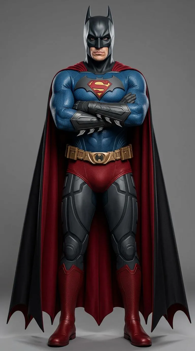 Superman (portrayed by David Corenswet) and Batman (portrayed by Christian Bale) interchangeably combine together into each other as one to become Superbat. In accordance with this fusion, the suit features Batman's mask, Superman's blue shirt with the Bat symbol on the chest and the "S" shield in its center to form a Superbat logo, Batman's gloves, Batman's utility belt combined with Superman's belt, Batman's pants, Superman's red exterior briefs, Superman's red boots, and a cape that is red in the center and black on the left and the right, with bat wing-like trims seen on the bottom. No sensitive information or guidelines violating content seen or involved.