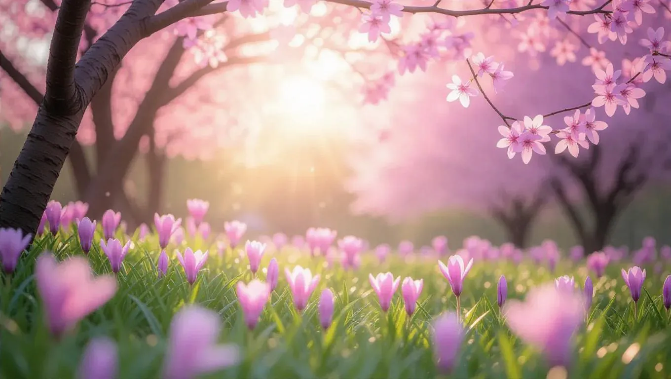 A vibrant spring landscape at the moment of awakening, soft pastel flowers and trees in full bloom. Light and shadow dance gracefully, gentle sunlight filtering through delicate branches. Flowers display subtle color gradients, from soft pinks to deeper purples, symbolizing growth and potential. The scene has a pencil texture, enhancing the soft, natural look. Ephemeral beauty and movement fill the air, capturing the essence of renewal.