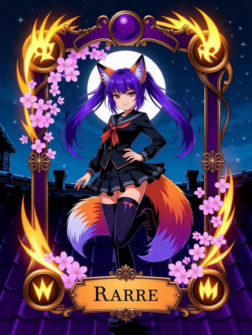 A vertical trading card illustration in anime style, featuring a fox girl character standing confidently inside an ornate fantasy card frame. The frame is adorned with glowing flames, cherry blossoms, and golden ornaments, with no text. The background glows with soft sparkles, enhancing the mystical ambiance. The character is centered and posed dynamically, matching her dark-elemental theme. The card has a magical, high-detail look, and the composition is designed for a game card. The fox girl has silver-purple twin tails and glowing red eyes, wearing a black school uniform with torn edges. She stands under moonlight on a rooftop, smirking slightly while holding a shadow blade. Her tails are sleek and low, exuding dark-element vibes.