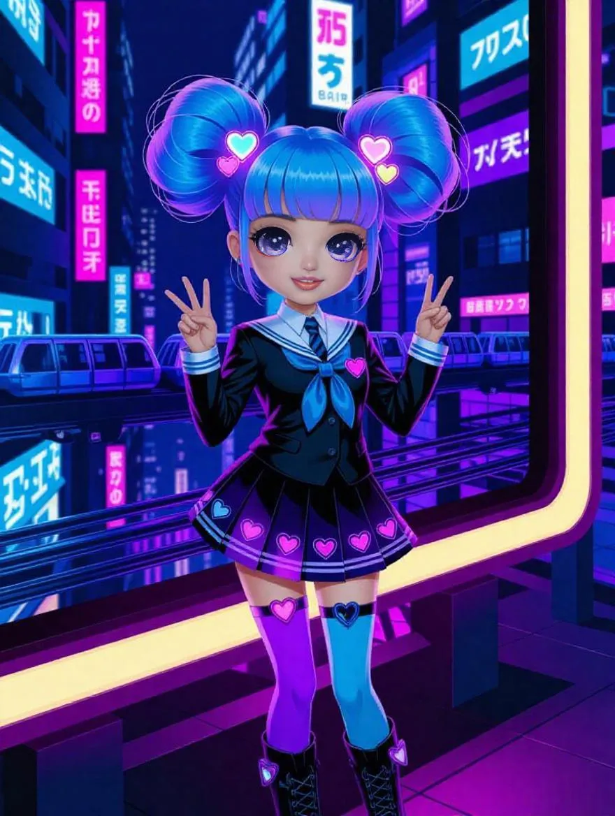 Vibrant anime-cyberpunk digital illustration of a cheerful girl with pastel twintails and holographic uniform glowing on a neon-lit futuristic billboard. Contrasts cold, rainy high-tech cityscapes with her warm presence, sparkling eyes, and playful pose. AI-generated art blends cyber-themed details, heart accessories, and glowing reflections for dynamic anime-inspired visuals.