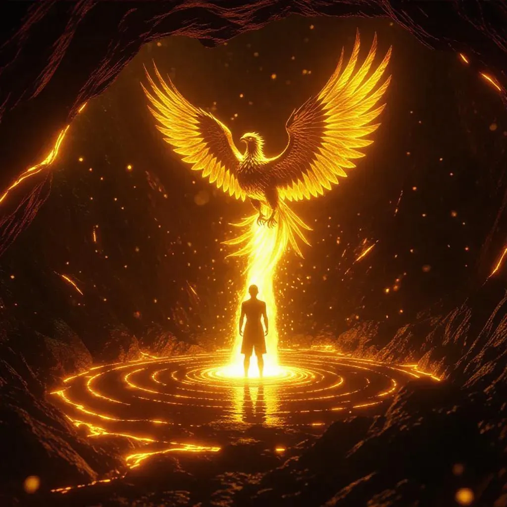 Ignite your creativity with this AI-generated cinematic scene of fiery rebirth. A molten-gold energy Phoenix emerges from volcanic flames, symbolizing transformation. Detailed volcanic caverns, swirling embers, and glowing reflections capture fantastical artistry. Perfect for fantasy visuals, cinematic storytelling, and symbolic AI-powered imagery blending fantasy, fire elements, and rebirth themes in vivid, warm-hued detail.