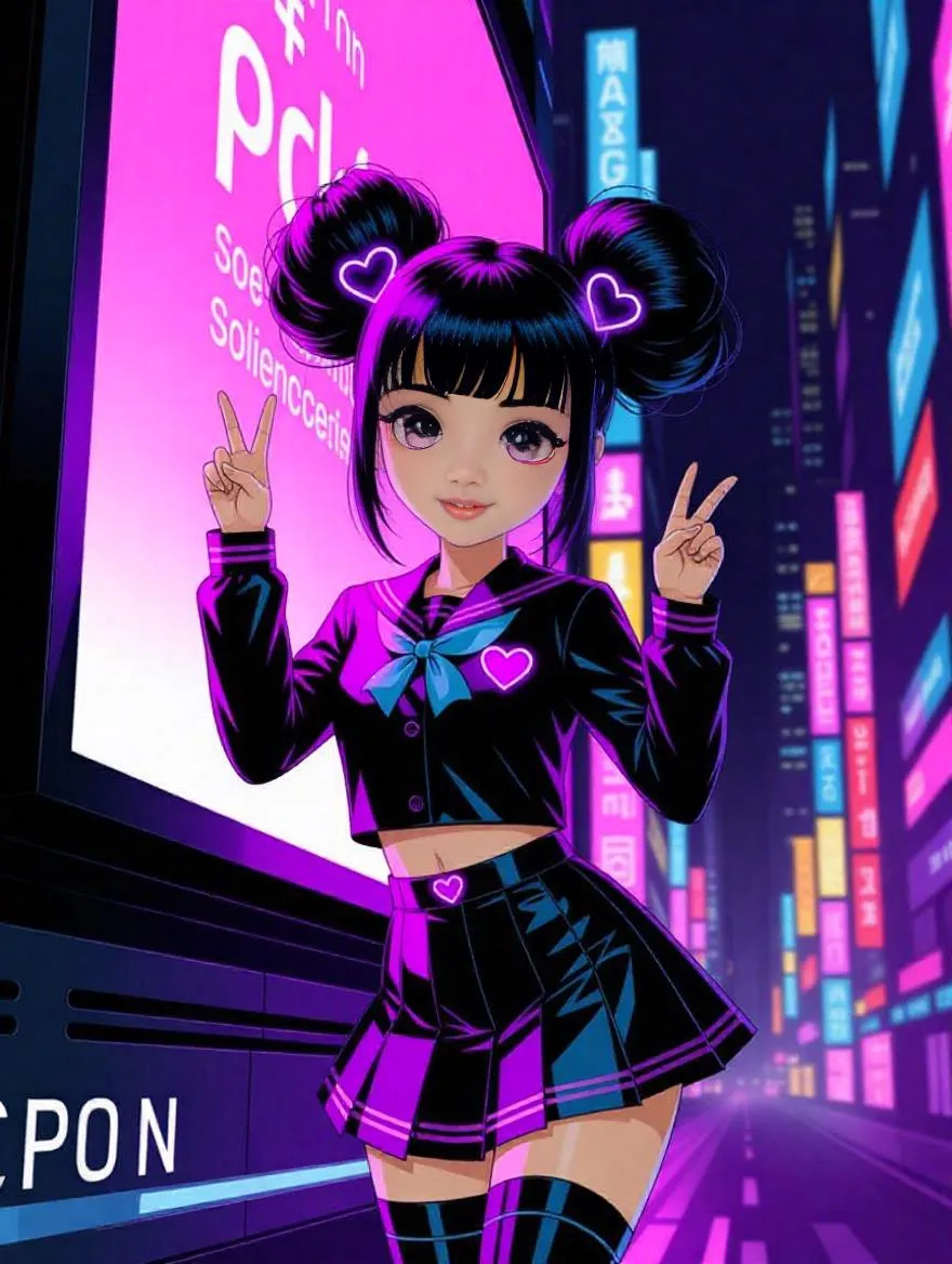 Vibrant anime-cyberpunk digital illustration of a cheerful girl with pastel twintails and holographic uniform glowing on a neon-lit futuristic billboard. Contrasts cold, rainy high-tech cityscapes with her warm presence, sparkling eyes, and playful pose. AI-generated art blends cyber-themed details, heart accessories, and glowing reflections for dynamic anime-inspired visuals.