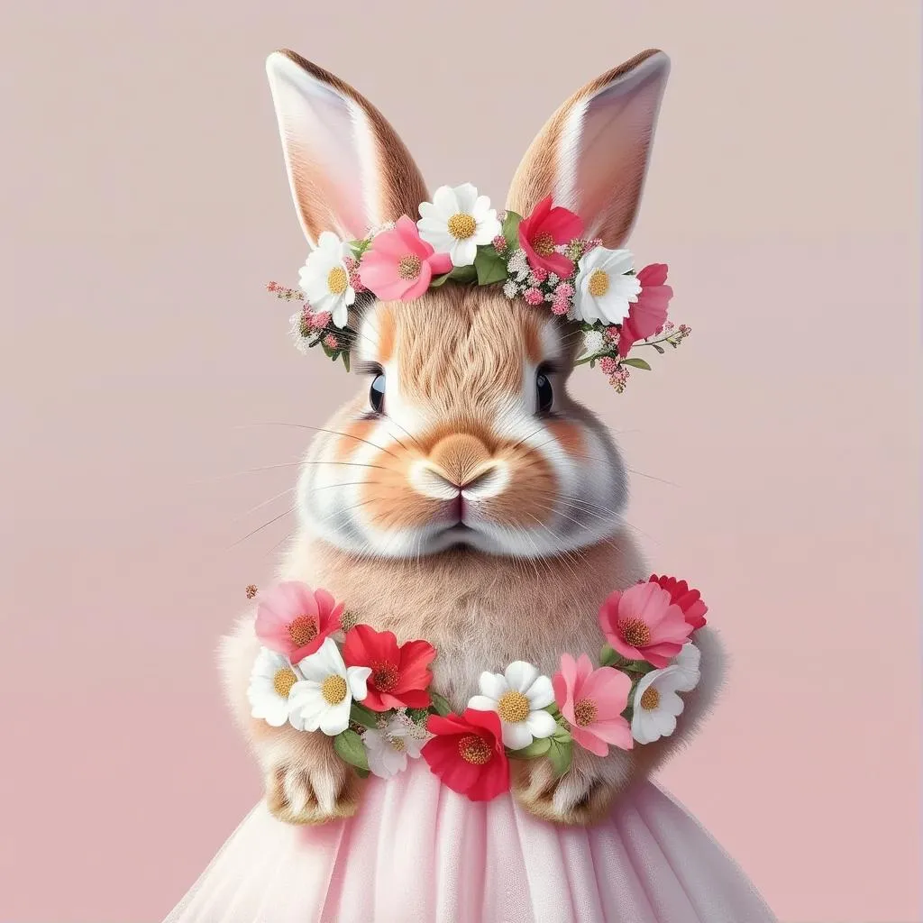 Generate a hyper-realistic bunny in a delicate flower crown and pastel pink dress, isolated on a solid background. Perfect for professional AI image creation with vivid details and lifelike textures. Ideal for high-quality visuals in sweet, light red and white color schemes.
