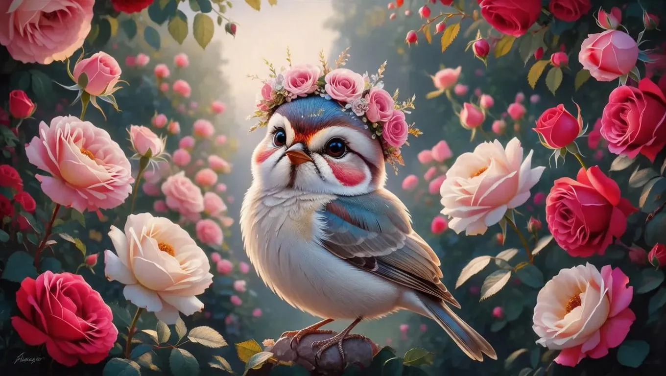 Create a charming AI-generated painting of a cute bird surrounded by vibrant roses. Transform text prompts into stunning artwork with vivid colors and intricate details using Vivago.ai. Elevate your creativity effortlessly with AI-powered tools for professional-grade visual results.
