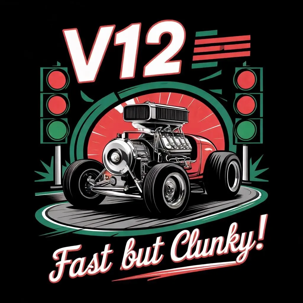 Create retro-inspired vector t-shirt designs with bold "V12" text, dynamic race track jalopy scenes, and playful "Fast but Clunky!" script. Enhanced by vibrant traffic light accents and humor-driven AI tools for eye-catching automotive-themed graphics. Perfect for quirky, professional-grade apparel art. #Vector #Design
