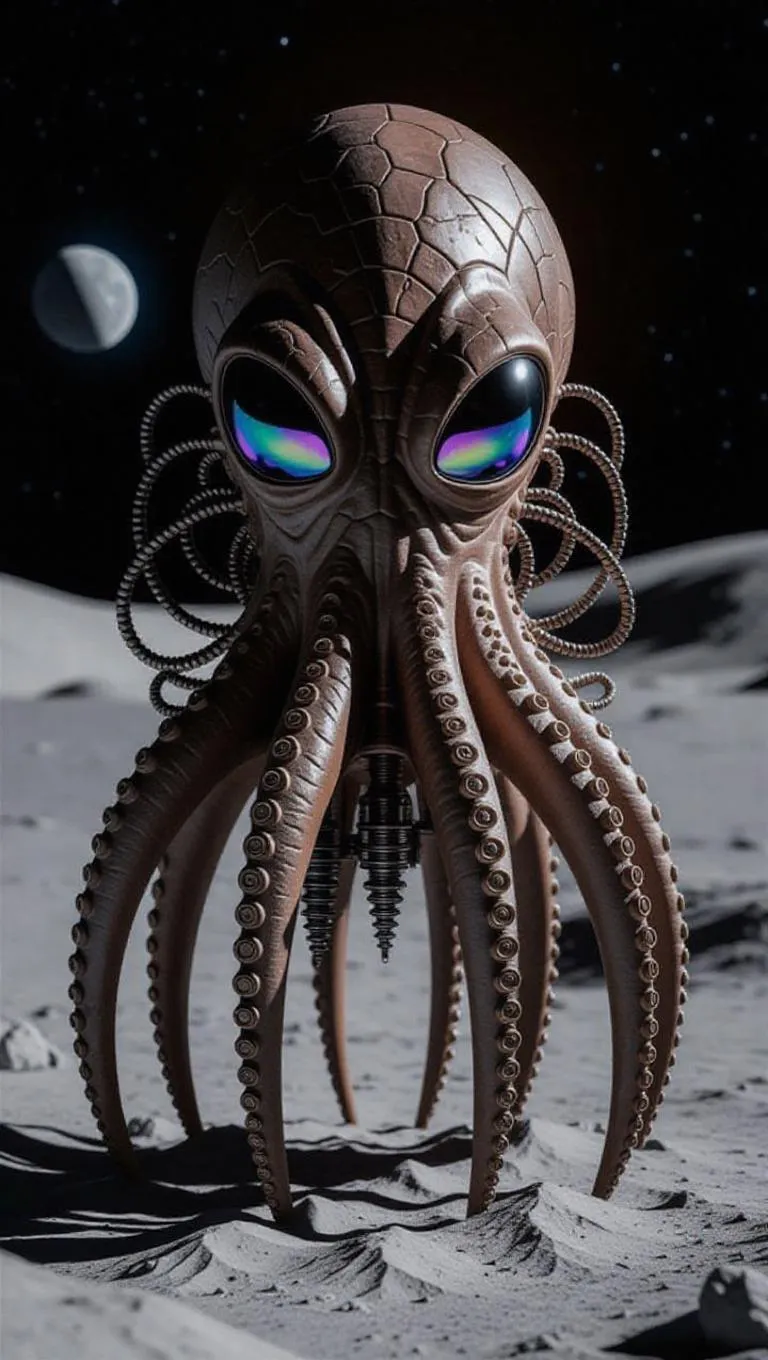 Alien cephalopod miner on the moon. Dry, cracked skin like stone. Shiny mirrored eyes reflect stars. No mouth, breathes through pulsing pores. Rooted limbs with drills, crusted in dust. Tubes, vents, and glowing sensors across its body. Fractal irises swirl. Movements slow, precise, seismic. Iridescent veins glow under worn plates. Crystalline tools extend. Silent vapor bursts from its back. A living machine—ancient, engineered, mining the void.