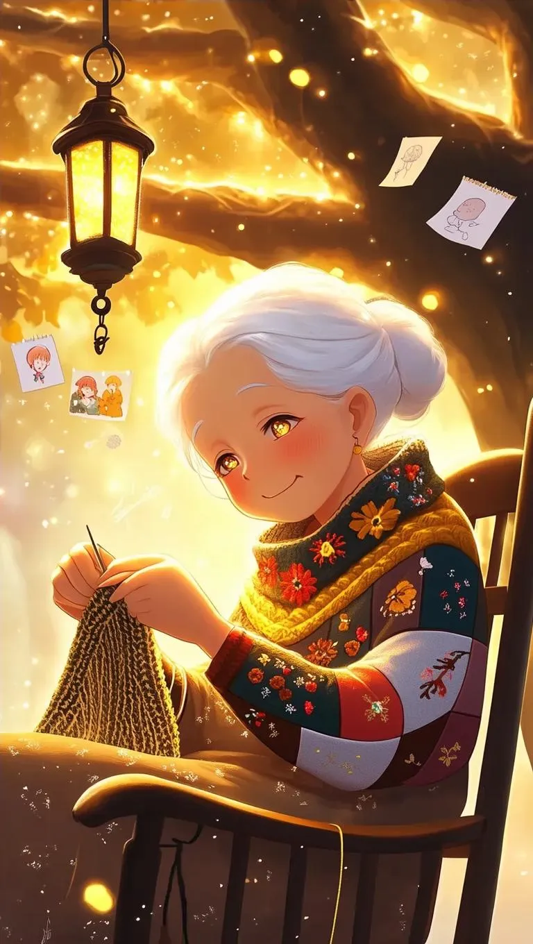 Generate nostalgic anime-style AI art of a wise elderly woman knitting golden light under a lantern tree. Vivago.ai crafts magical, memory-themed scenes with floating children's drawings, warm ambient lighting, and intricate details for enchanting visual storytelling using text-to-image AI tools.