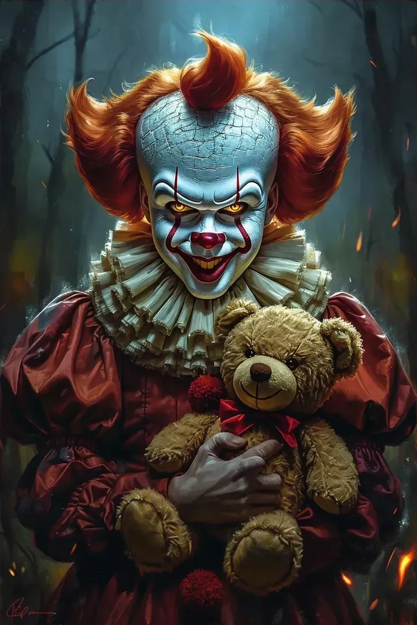 Generate a haunting digital painting of Pennywise clutching a teddy bear with dramatic lighting, blending realism and surrealism in dark, moody aesthetics. Inspired by Esao Andrews and Audrey Kawasaki's styles, this AI artwork merges horror and artistry for spine-chilling visual storytelling.