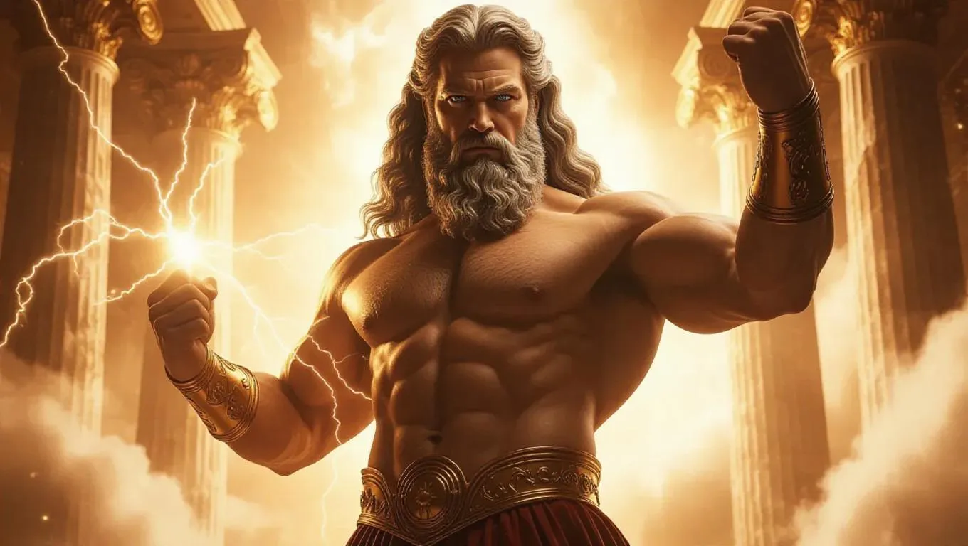 Hyper-realistic AI-generated Zeus portrait captures divine authority with intricate Greek god attire, glowing lightning bolt, and majestic Mount Olympus backdrop. Dynamic hair, intense glowing eyes, and symmetrical composition highlight his dominance. Dramatic golden lighting and marble columns enhance Olympian grandeur. Professional-grade AI art tool for myth-inspired visuals, detailed physique, and ethereal divine ambiance.