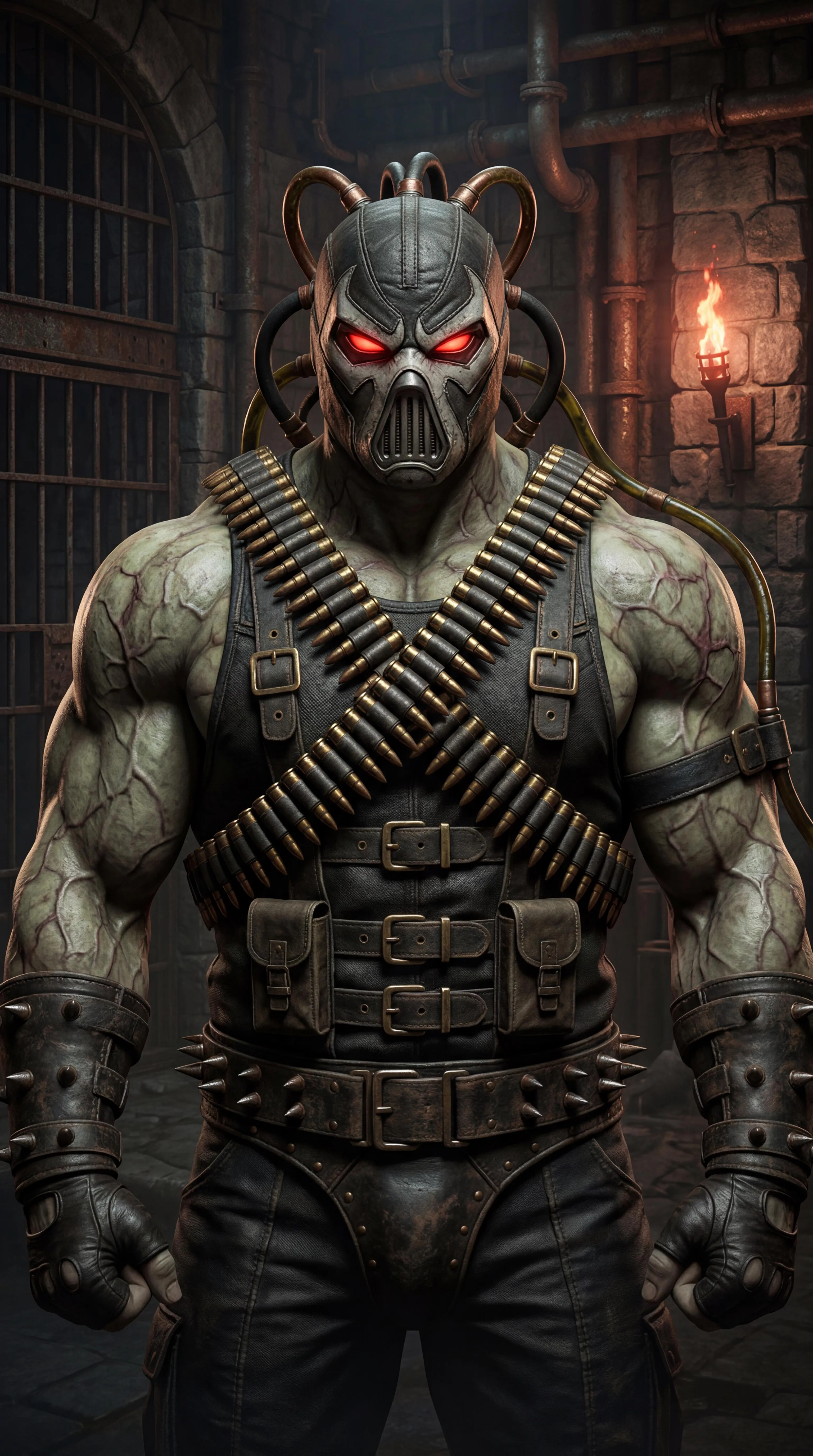 The art style from how Bane appears in the comics are translated into the realistic aesthetic of Robert Swenson's live-action portrayal of Bane (from Batman & Robin), albeit in a more gothic tone instead of a flashy direction. He isn't firing his gatling gun, nor is there any artist signature seen. No sensitive information or guidelines violating content seen or involved.