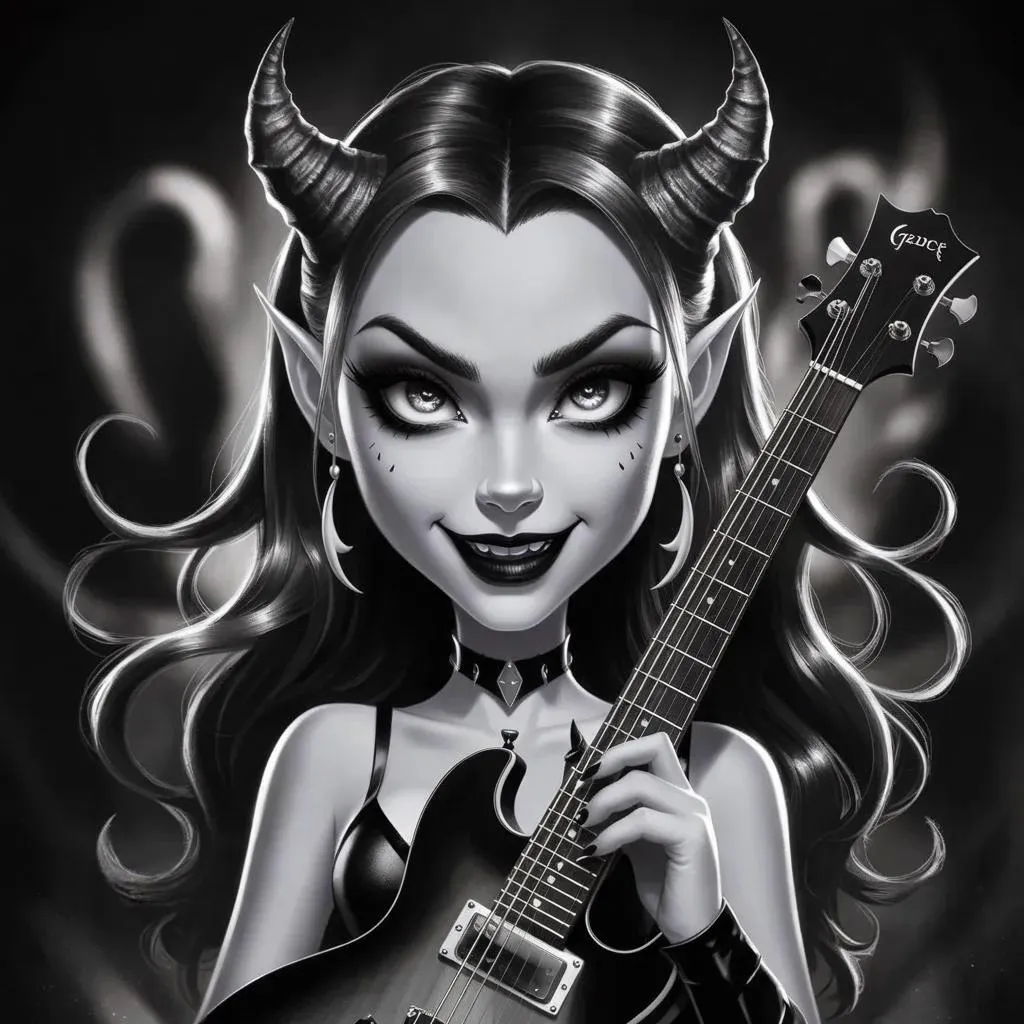 Generate an AI-powered gothic cartoon vampire profile picture: mysterious black-clad girl with vampire teeth, horns, and guitar. Blurred face, flowing hair, supernatural aesthetic. Perfect for edgy avatars or dark-themed visuals. Vivago.ai transforms text/image prompts into striking AI art with professional effects and creative customization tools.