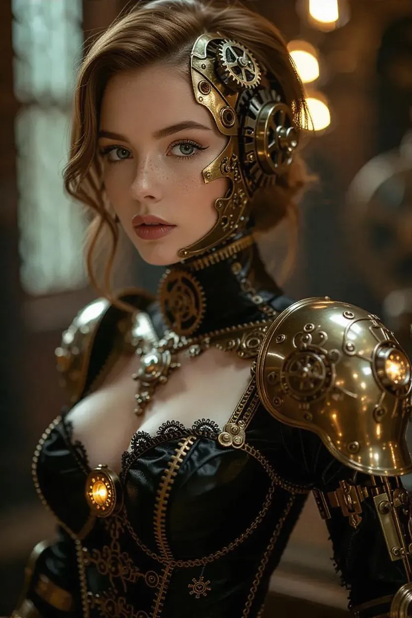 Steampunk woman-robot, reminiscent of Oriana from League of Legends, intricate brass gears and cogs, elegant Victorian aesthetics, glowing mechanical eyes, poised in a futuristic yet nostalgic setting, with steam and clockwork elements.