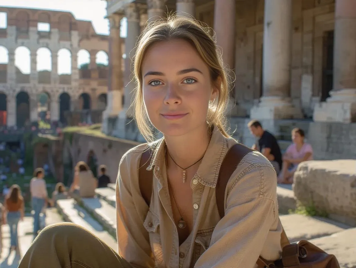 Experience a vivid 8K AI-generated portrait of a 30-year-old traveler with natural skin texture, blue eyes, and subtle wrinkles. Relaxed on Roman Forum's ancient steps, she wears olive pants, a dusty rose shirt, and a beige sweater. Sunlit ruins blur behind her. Wide-angle 35mm lens captures waist-up realism, travel-worn leather bag, and authentic details—no artificial gloss.