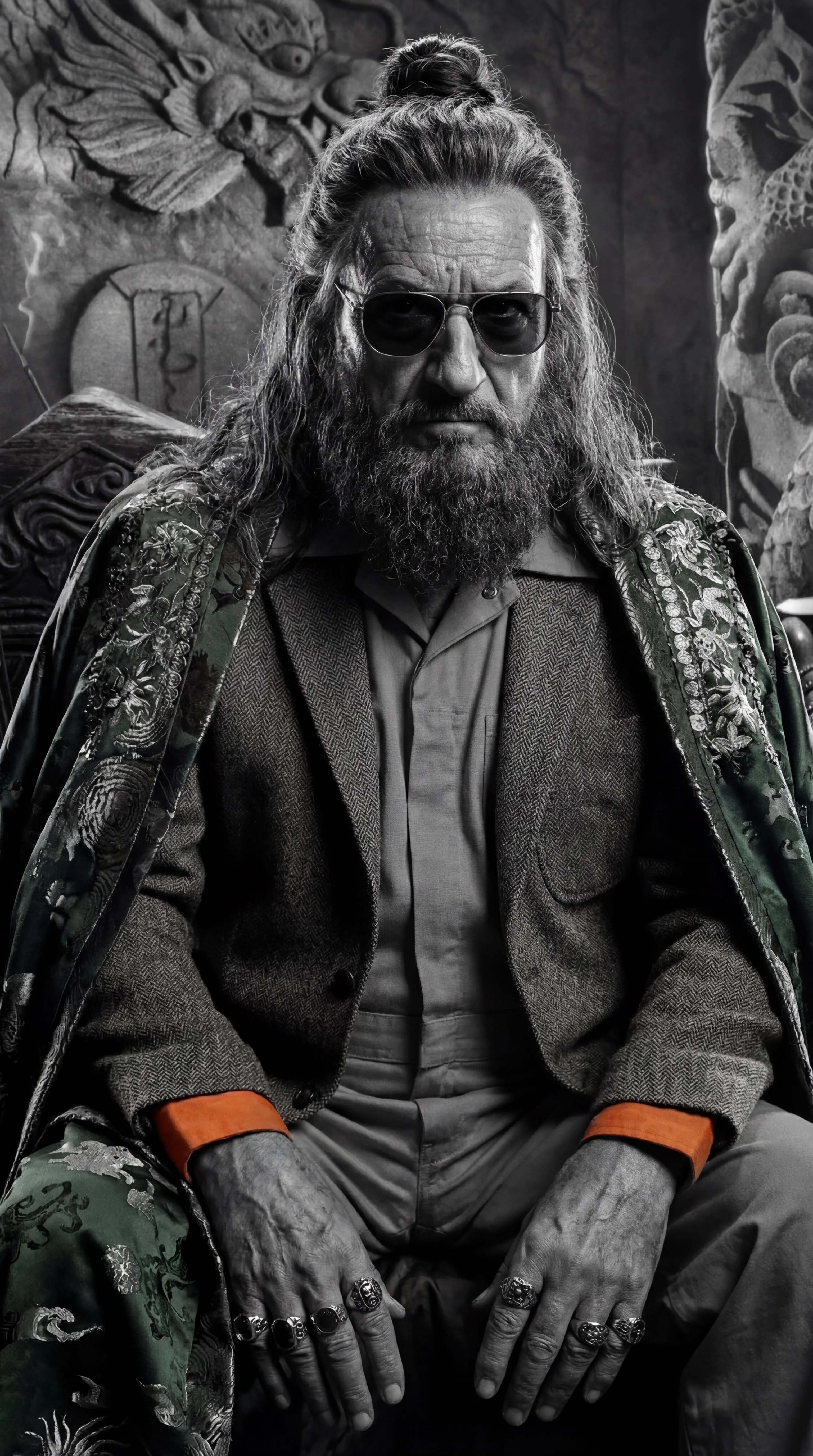 Create a seamless composite of Ben Kingsley's Trevor Slattery in black-and-white. Fuse four distinct looks: Iron Man 3 warlord attire, Marvel One-Shot jumpsuit, Wonder Man sport coat, and Shang-Chi's ornate dragon robe. Maintain sunglasses, ten rings, combined hairstyles, and goatee. Generate this unique Marvel character fusion with AI.