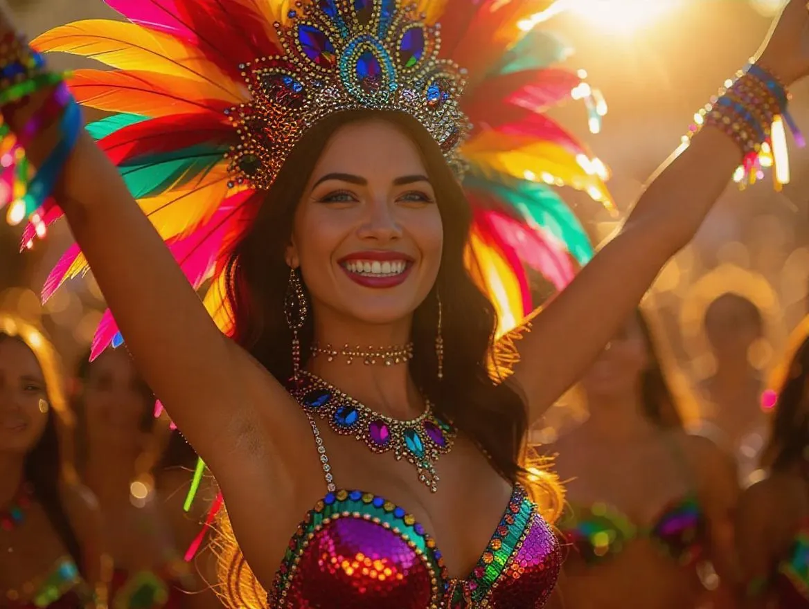 Capture the energy of Rio Carnival with AI-generated visuals of a radiant woman performing in vibrant costumes. Highlight her joyful smile, dynamic movements, and the festive atmosphere. Perfect for creating eye-catching event promotions, cultural content, or social media posts. Elevate your projects with vivid, professional-grade AI effects and lifelike details.