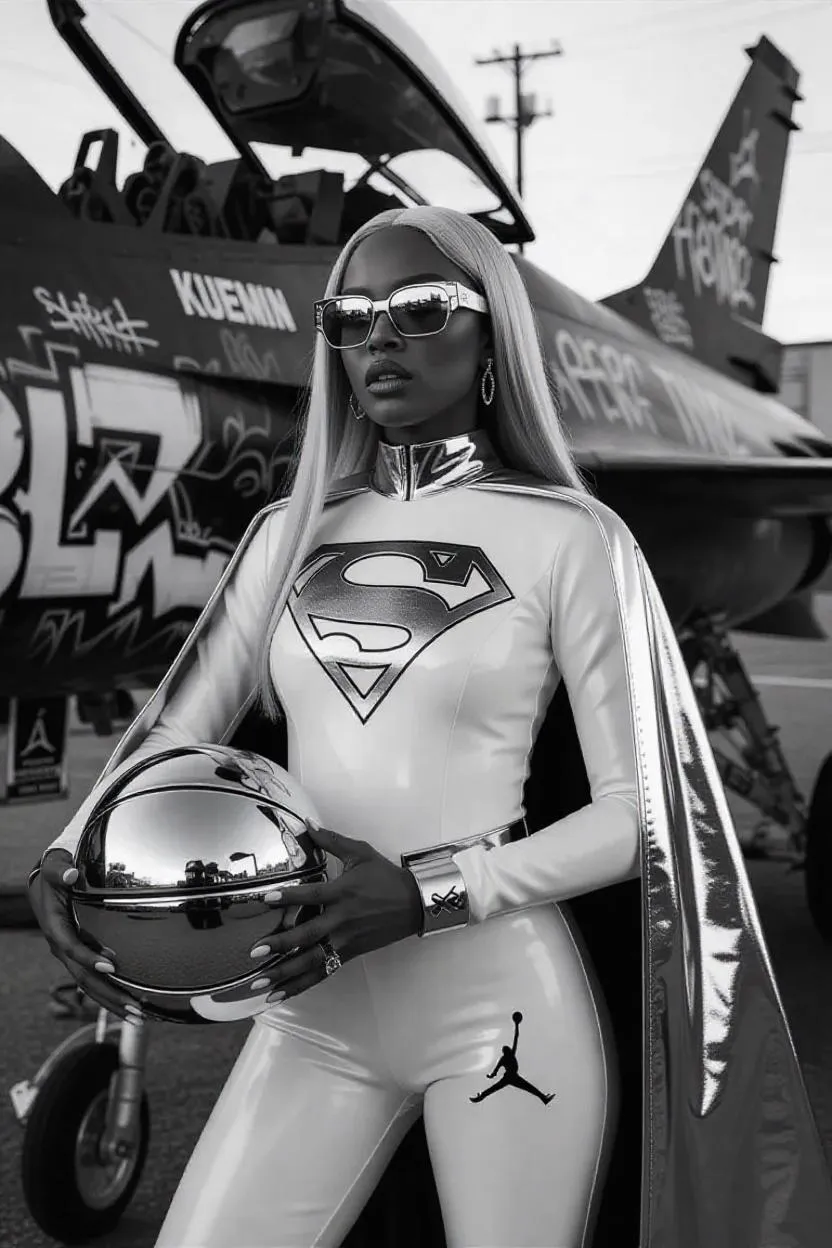 AI-generated black and white superhero imagery of Aaliyah Haughton in chrome-accented Superman suit, neon-lit cyberpunk jet, and graffiti details. Featuring KUECHE perfume, Jumpman 23 icon, reflective basketball, and dystopian backdrop. Vivago.ai crafts cinematic drama with sharp lines, wide-angle lens, hyper-detailed shadows, and futuristic neon accents for striking AI art.