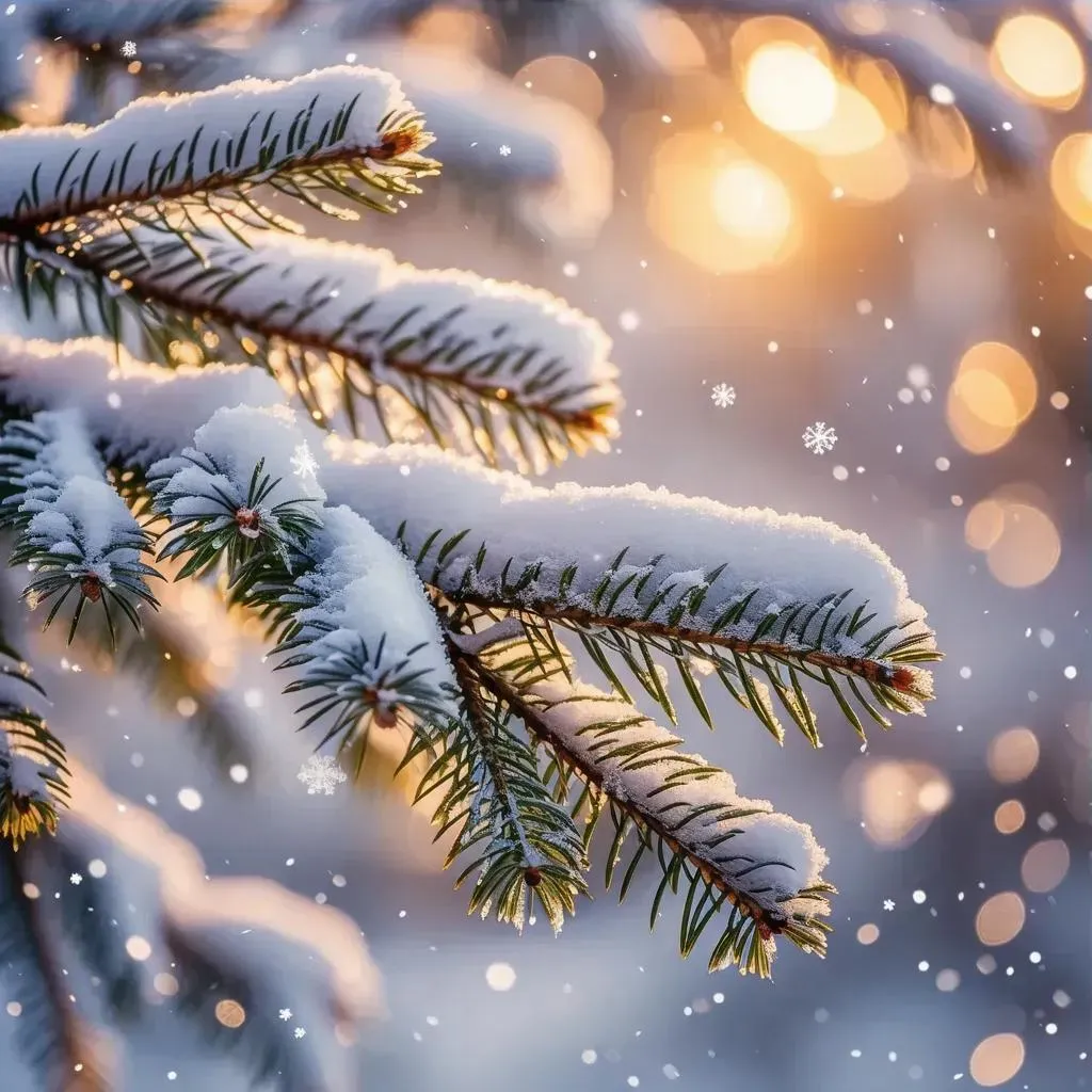 Capture the serene beauty of winter with this AI-generated close-up of a snow-covered pine branch. Fresh snowflakes glisten under warm light, intricate pine needles sharp against a softly blurred backdrop. Experience nature's stillness in this peaceful wintry scene, blending delicate snowfall, sparkling textures, and tranquil vibes—perfect for evoking winter's magic through AI-powered visual storytelling.