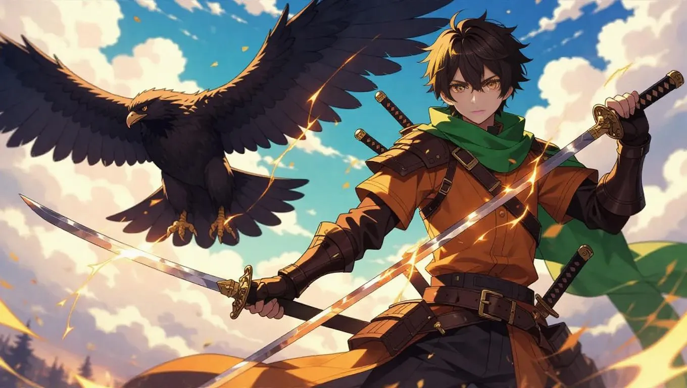 Generate a dynamic 2D anime character with light brown skin, dark orange eyes, and jet-black wavy hair. Outfitted in an autumn forest-themed Robin Hood-inspired ensemble with a crystal katana emitting golden lightning. Soar through skies with a thunderbird companion, harnessing orange lightning powers. AI-crafted vivid anime visuals for striking digital art and storytelling.