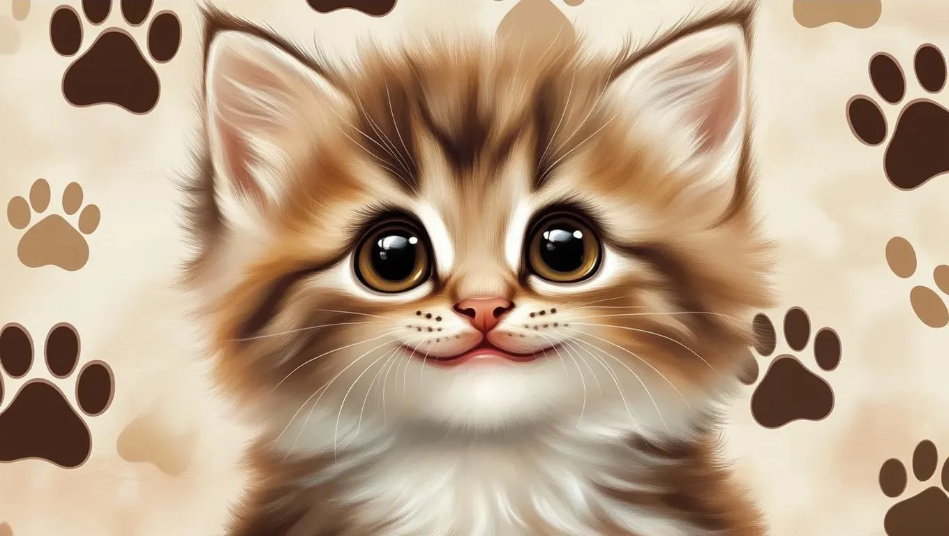Create a realistic digital painting of an adorable kitten with fluffy fur, expressive eyes, and a cheerful smile. Features seamless cat paw print patterns in warm brown-beige tones, smooth gradients, vibrant colors, and professional polish. Ideal for photorealistic yet stylized digital art with a glossy, inviting aesthetic.