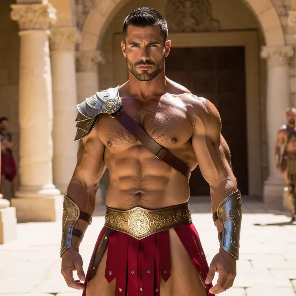 AI-generated image of a powerful, muscular Greco-Roman warrior. Bare-chested with glistening abs in detailed silver and red leather armor. Striking blue eyes, strong jawline, sensual vibe in a sunlit stone courtyard palace with arches. Full body, sexy fantasy image. (54 words)
