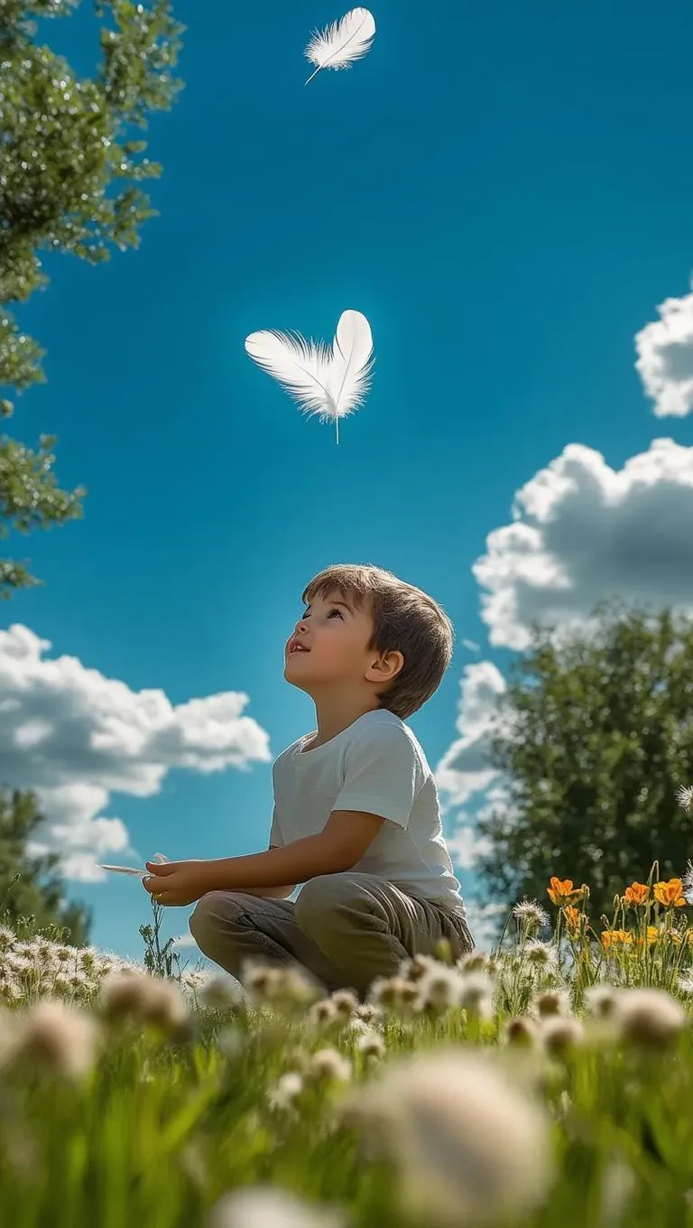 Create AI-generated visuals of a child discovering a white feather with awe and gratitude using vivago.ai. Transform text prompts into magical realism scenes, perfect for storytelling, emotional narratives, or whimsical art. Explore AI image generation tools for lifelike details and creative effects. Elevate your projects with professional-grade AI-powered visuals.