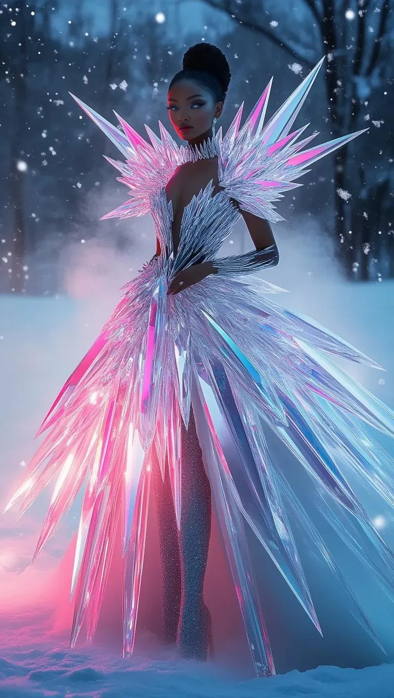 Create ultra-detailed AI art with vivago.ai: Generate a hyper-realistic futuristic woman in a surreal snowy scene. Her crystal gown refracts neon pink and icy blue light, surrounded by ethereal mist, shimmering snowflakes, and a frosty backdrop. Ideal for surreal art blending futuristic elegance, glowing auras, and ultra-realistic details. Transform prompts into vivid, otherworldly visuals effortlessly.
