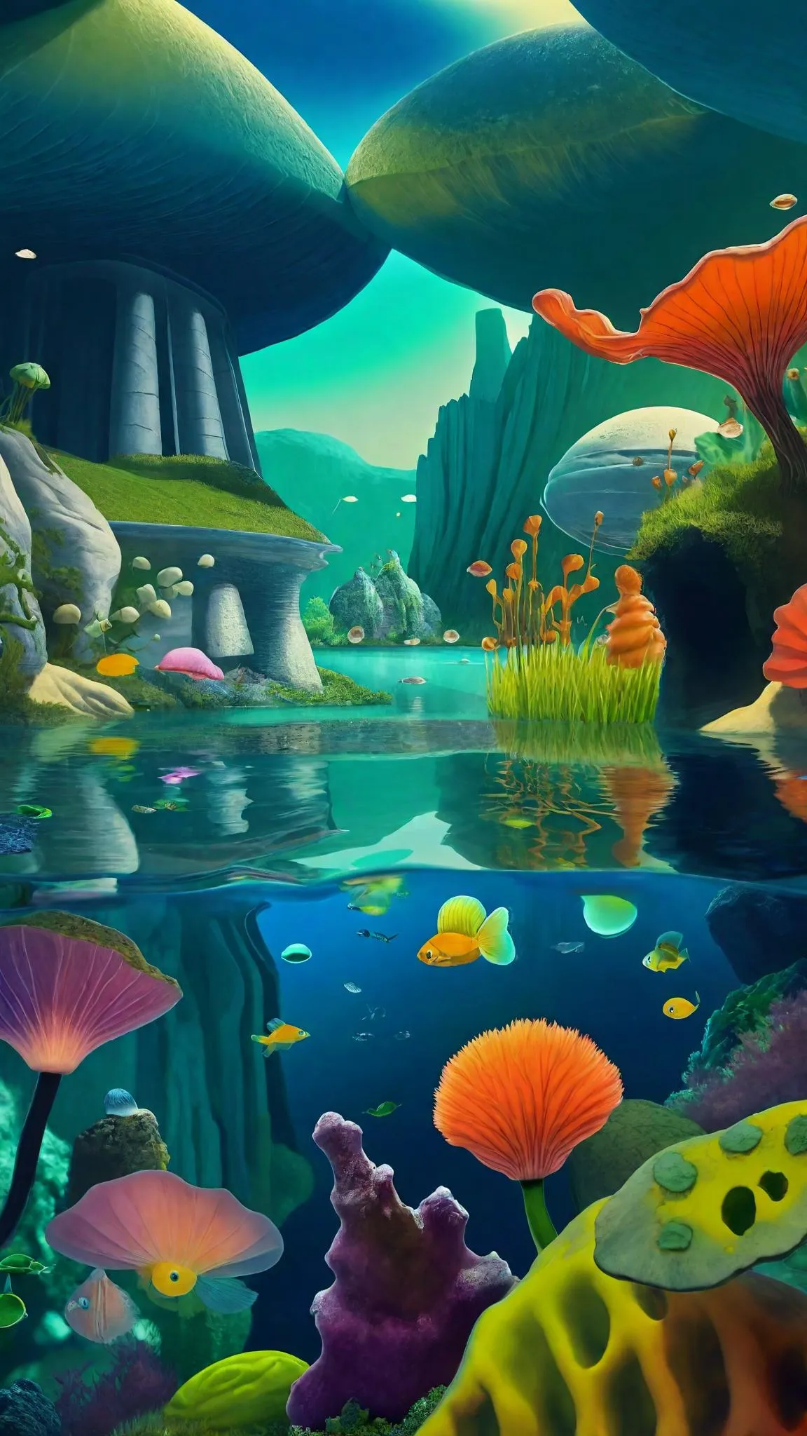 Dive into an AI-generated Cretaceous underwater cityscape with a submerged camera view. Clear blue-green waters reveal psychedelic Eric Carle creatures roaming natural rocks and coral reefs. Explore surreal underworld scenes, lunar landscapes, and meadows with our AI effects for stunning aquatic visuals. Perfect for underwater photography and creative waterpark-themed projects.