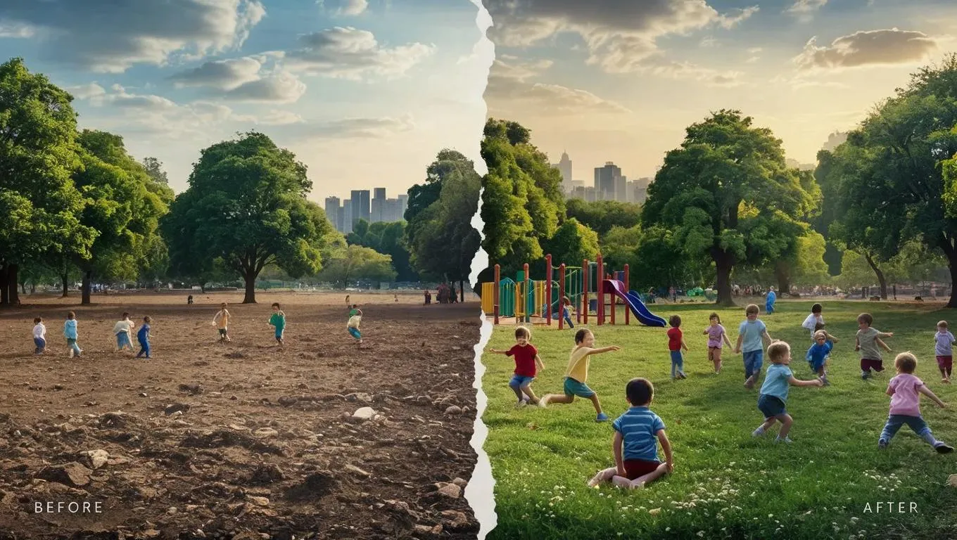 Transform barren landscapes into vibrant parks with vivago.ai's AI tools. Explore a split-image contrast: a treeless environment vs. a lush green park with kids playing. Perfect for visualizing environmental impact, creative storytelling, or before-and-after projects. Generate professional-grade visuals effortlessly using AI image effects and prompts.