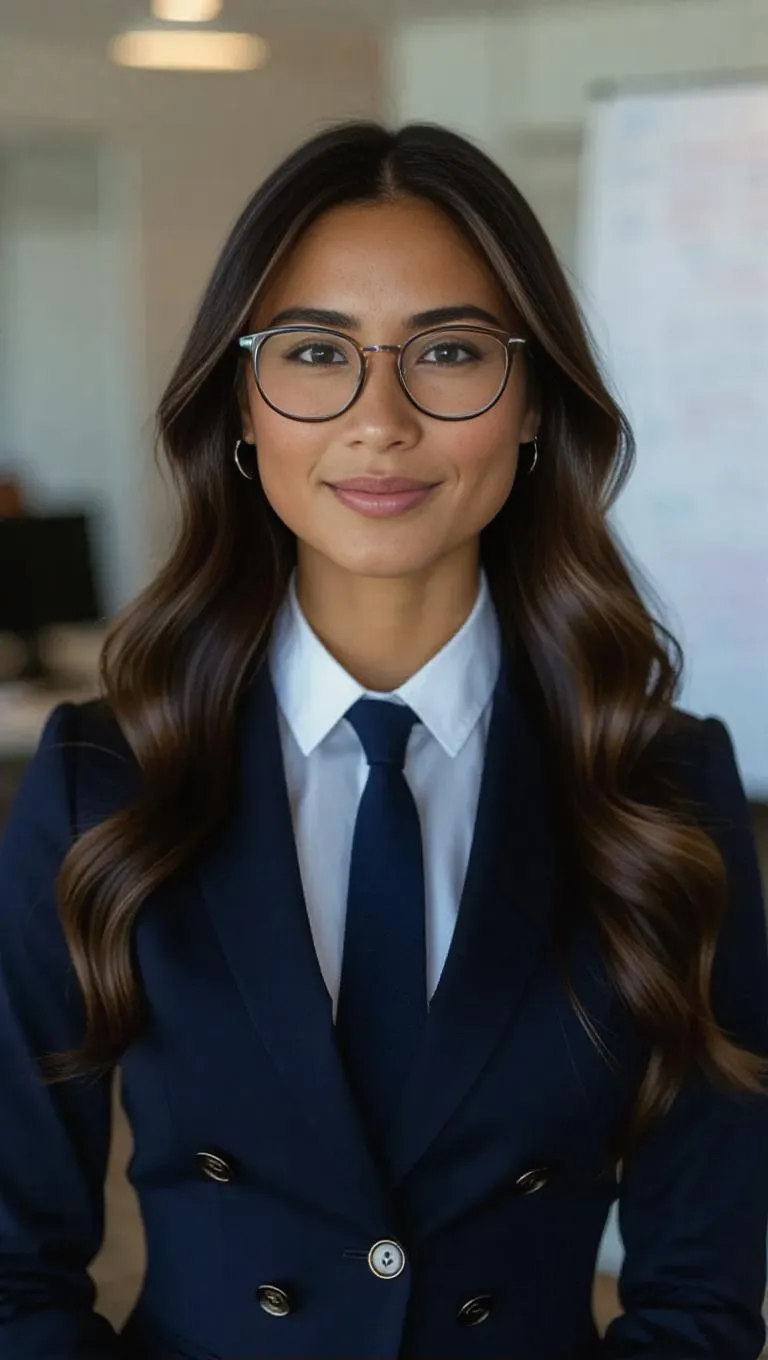 Create professional AI-generated images of a corporate woman in a navy outfit, white dress shirt, and metallic glasses. Perfect for business visuals in modern office settings. Use vivago.ai's AI tools to craft lifelike, professional-grade images for branding, presentations, or training materials with precise details like wavy hair, olive skin, and office backdrops.