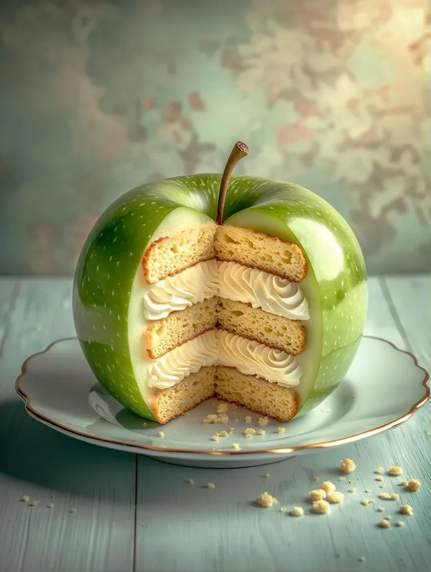 A surreal still-life image of a vibrant green apple, pristine and glossy under soft studio lighting. When sliced open, instead of fruit, the interior reveals the rich, layered texture of a golden sponge cake with cream filling—each slice showing delicate crumbs and airy swirls. The cut surfaces contrast sharply with the smooth apple skin, creating a whimsical, mouthwatering paradox. Presented on a porcelain plate with a muted, painterly background in pastel tones. The composition blends hyperrealistic detail with surreal charm, evoking fine pâtisserie photography infused with fairytale logic. A visual metaphor of hidden sweetness and playful surprise.