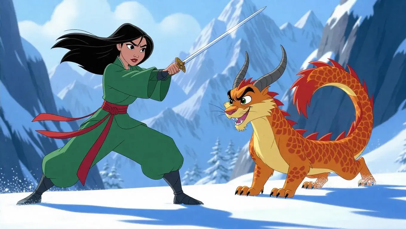 Vivid AI-generated art of Mulan training with Mushu in snowy mountains, blending cool icy landscapes with warm-toned determination. Experience dynamic contrast between fierce expressions and serene backdrops through AI-powered visual storytelling. Perfect for fantasy scenes, character design, or epic adventure themes.